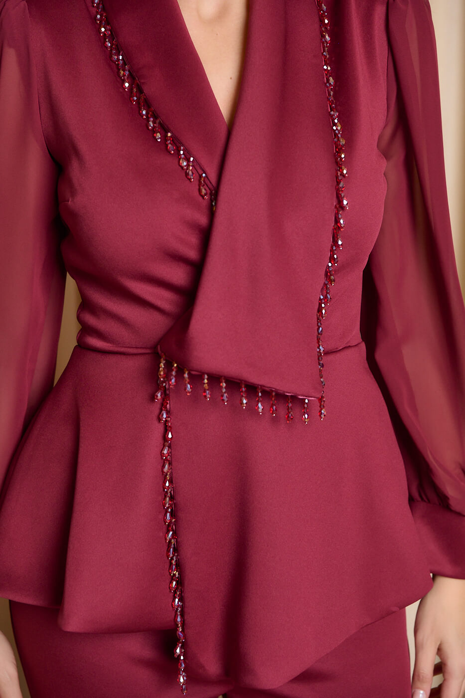 Κοστούμι με διακοσμητικές χάντρες βουργουνδί. Το σακάκι έχει πέπλουμ κόψιμο ,που αναδεικνύει τη μέση , μεγάλο εντυπωσιακό πέτο γιακά με κρεμαστές  χάντρες και βάτες στους ώμους. Τα μανίκια είναι διαφάνεια με μανσέτες και διακοσμητικό κουμπί κόσμημα. Κλείνει με φερμουάρ στο πλάι . Το παντελόνι είναι σε ίσια γραμμή και κλείνει με φερμουάρ.