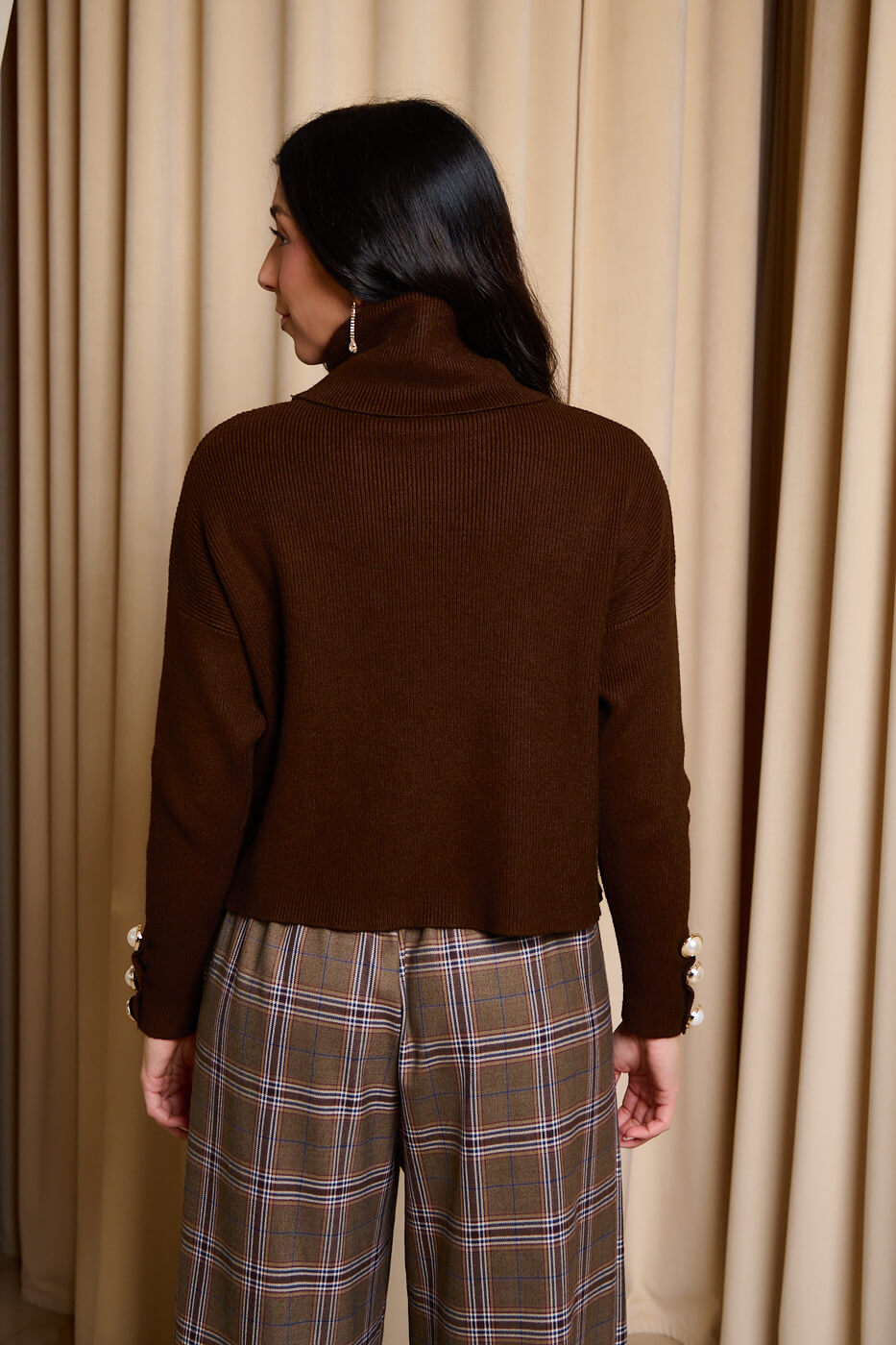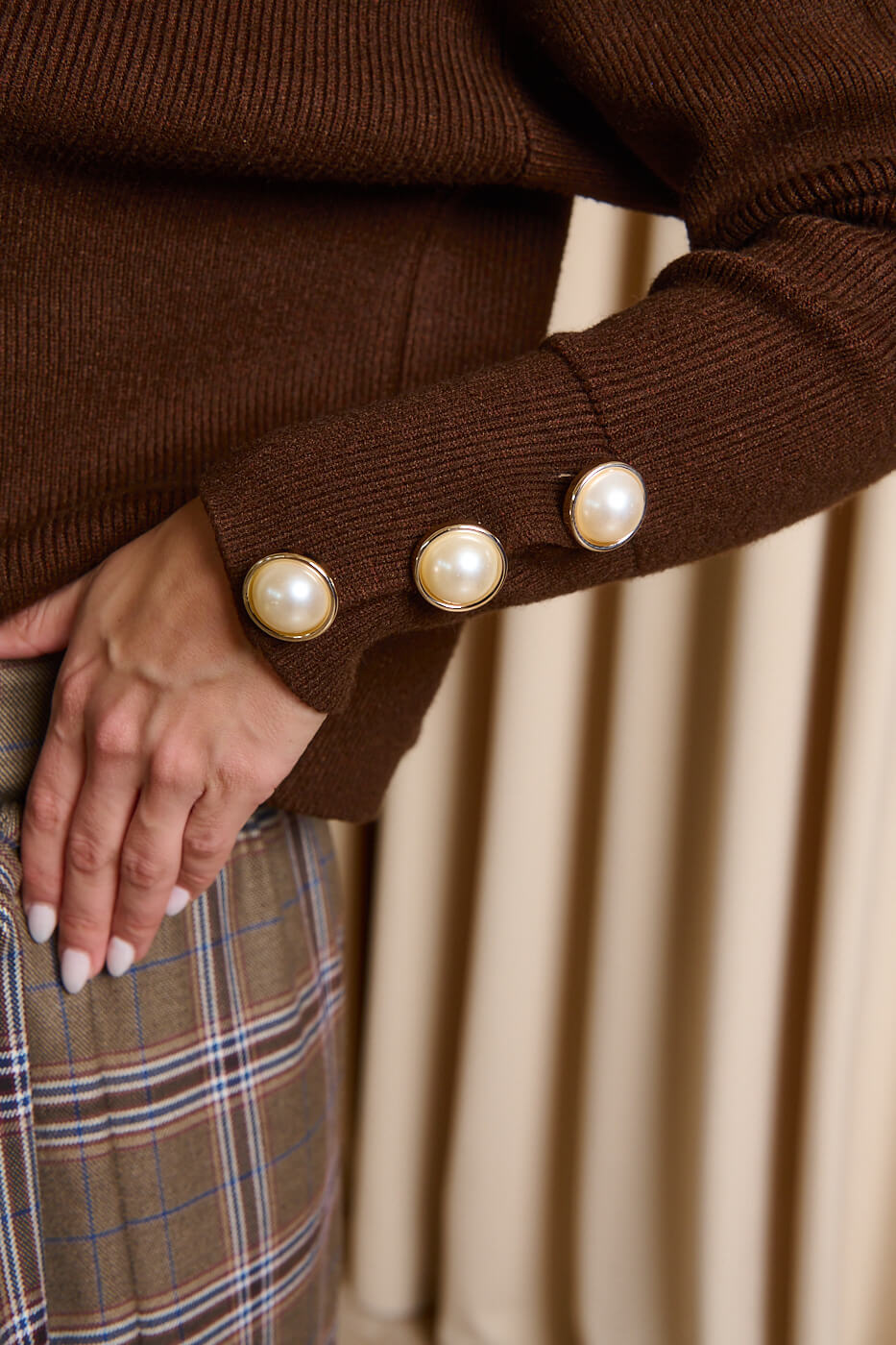 Μπλούζα πλεκτή καφέ. Η μαλακή πλέξη προσφέρει άνεση ενώ ο φαρδύς γιακάς προσθέτει κομψότητα. Η κοντή γραμμή του αναδεικνύει τη μέση και το καθιστά ιδανική επιλογή για ψηλόμεσα παντελόνια. Διαθέτει διακοσμητικά κουμπιά με πέρλα και χρυσό περίγραμμα στα μανίκια.