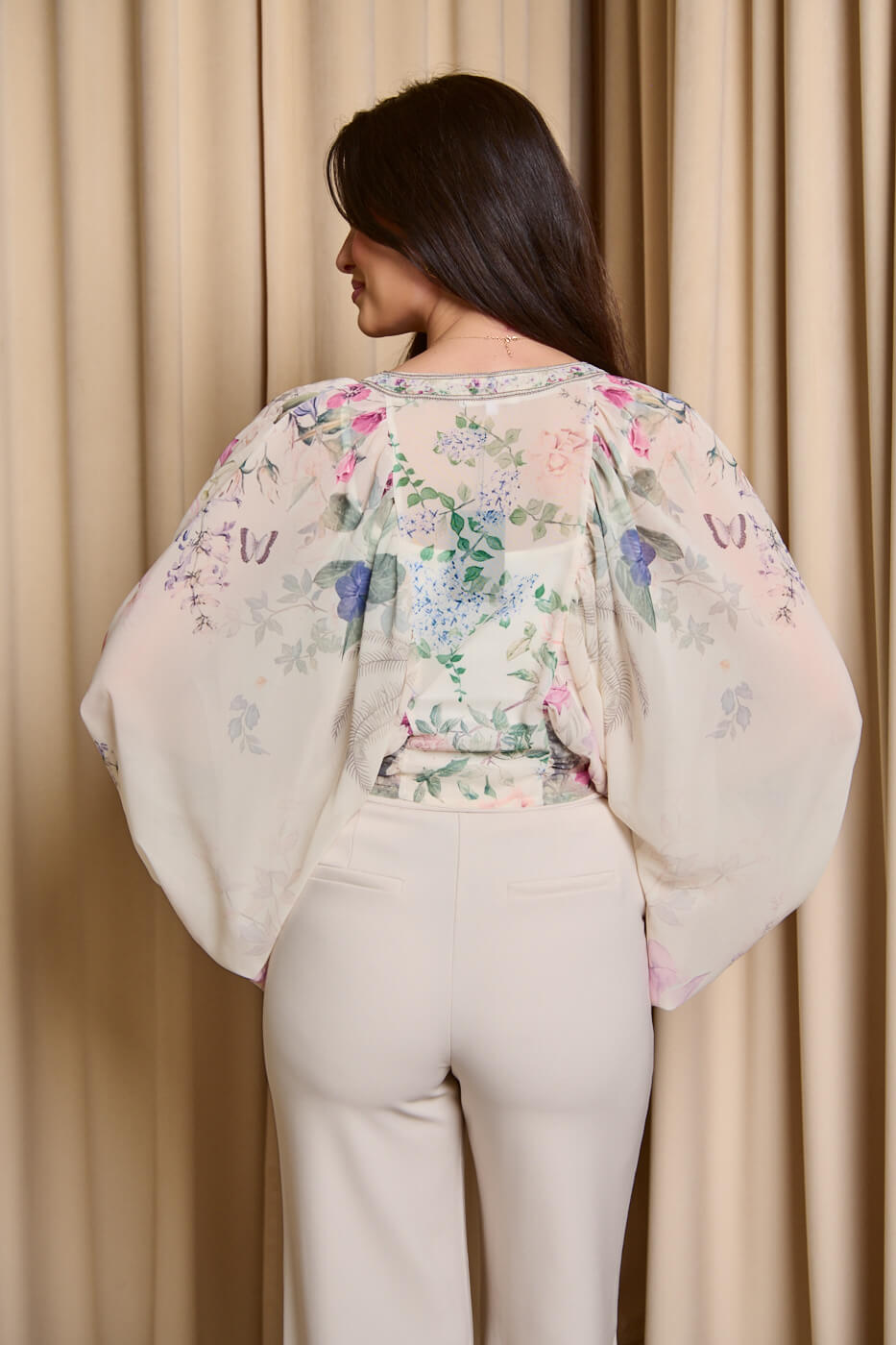 Μια αέρινη μπλούζα με floral μοτίβο πάνω σε εκρού βάση. Διαθέτει εντυπωσιακά μανίκια τύπου νυχτερίδα με λάστιχο στο τελείωμα. Έχει V ντεκολτέ με floral πατιλέτα και δέσιμο μπροστά.