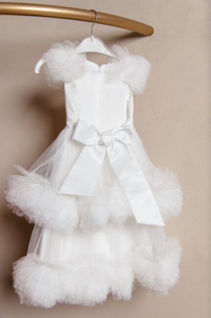 Παιδικό φόρεμα με πέρλες και τούλινα βολάν baby pink. Το πάνω μέρος έχει κομψή γραμμή, ενώ στη μέση ξεχωρίζει η ραμμένη ζώνη με εντυπωσιακές πέρλες που χαρίζουν λάμψη. Το κάτω μέρος αποτελείται από πλούσια τούλινα βολάν που δίνουν όγκο και παραμυθένια αίσθηση. Οι χοντρές τιράντες είναι στολισμένες με τούλι, ενώ στο πίσω μέρος διαθέτει ζώνη. Εσωτερική φόδρα.