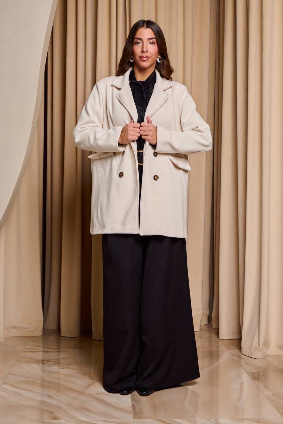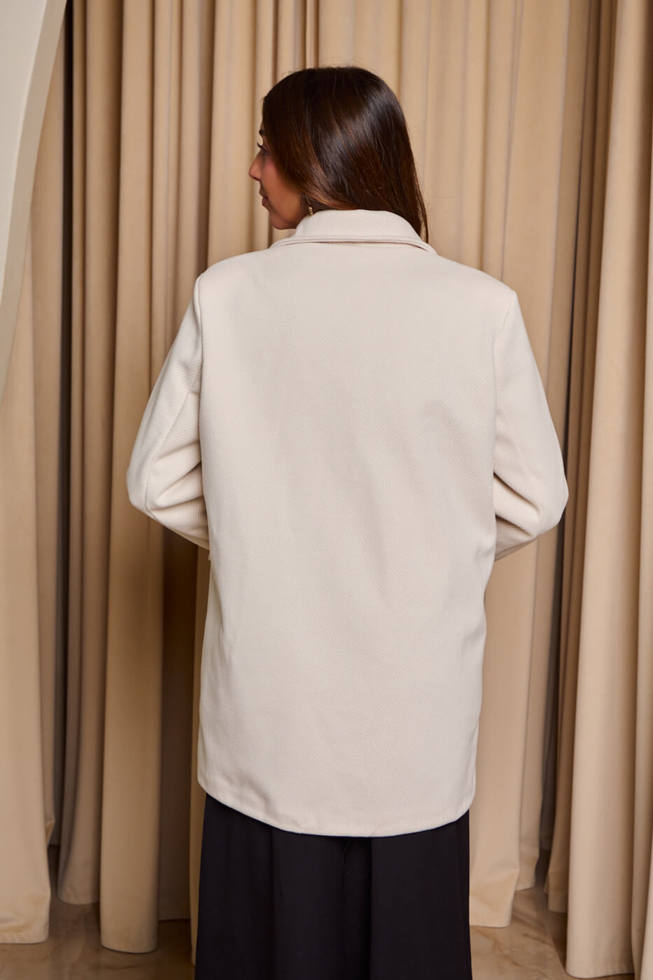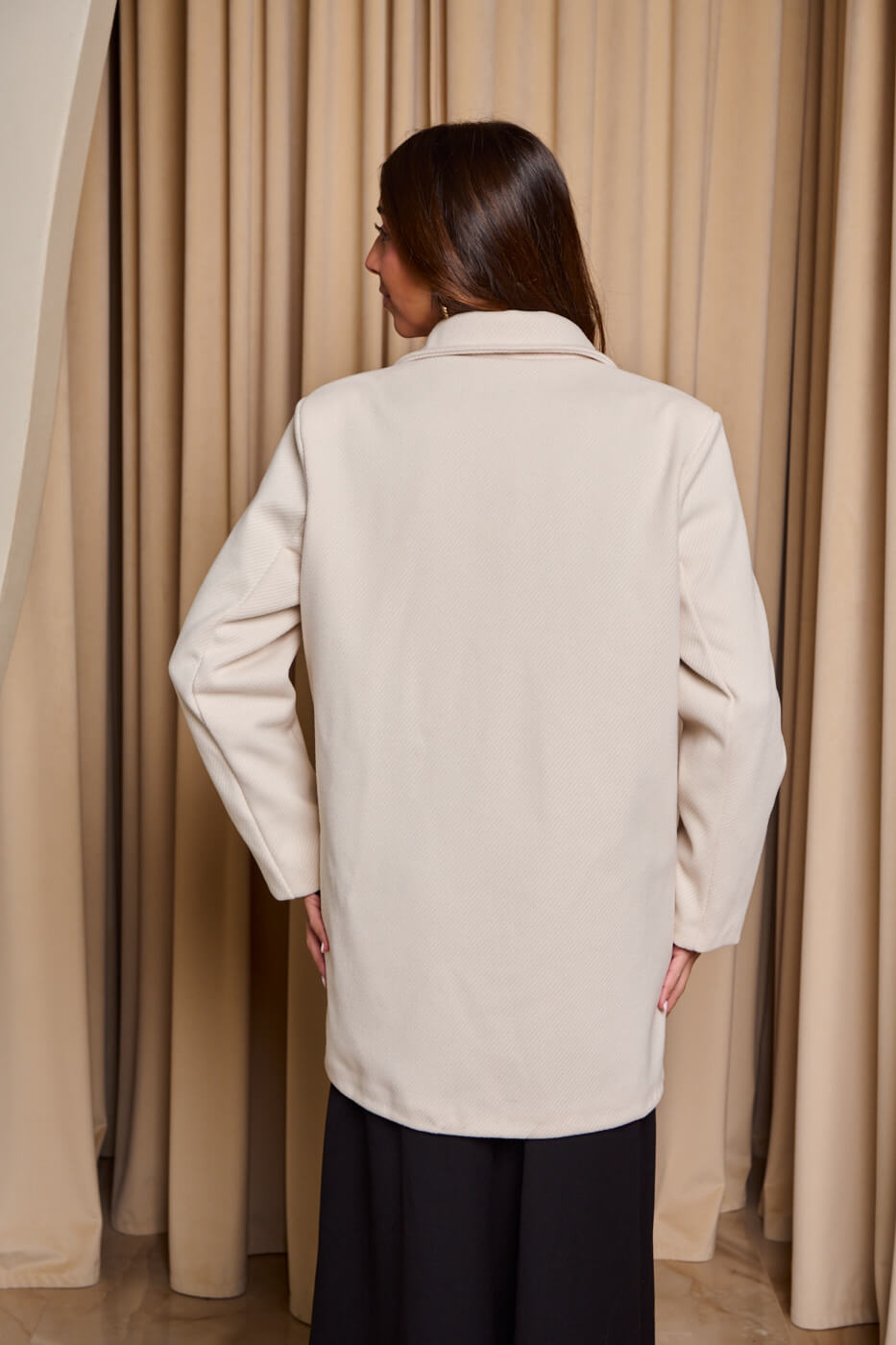 Με μακριά μανίκια και πέτο γιακά. Κλείνει μπροστά με κουμπιά. Διαθέτει διακοσμητικές τσέπες στο πλάι και εσωτερική φόδρα.