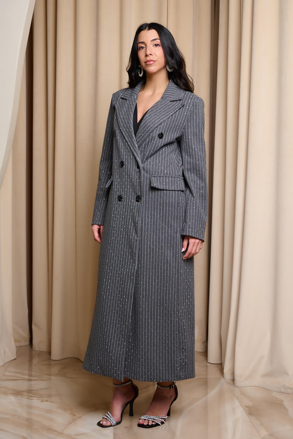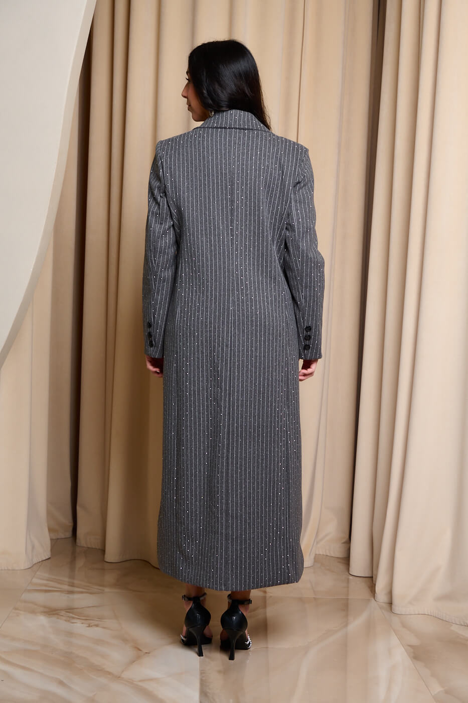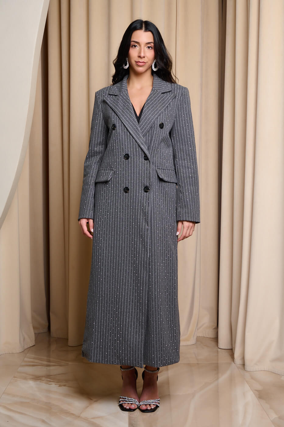 Παλτό με στρας γκρι. Ένα κομψό γκρι μακρύ παλτό με διαχρονικό σχεδιασμό. Οι κάθετες ρίγες σε πιο ανοιχτό γκρι και τα διάσπαρτα στρας σε όλο το μήκος του το καθιστούν ιδανικό όχι μόνο για καθημερινές αλλά και για επίσημες εμφανίσεις. Διαθέτει πέτο γιακά και διπλό κούμπωμα με μαύρα κουμπιά.