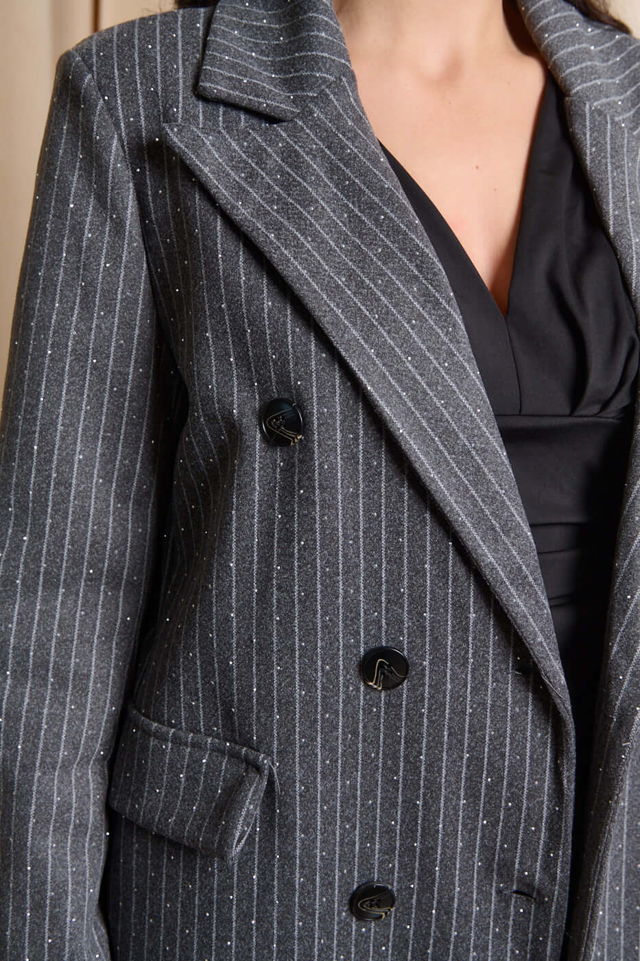 Παλτό με στρας γκρι. Ένα κομψό γκρι μακρύ παλτό με διαχρονικό σχεδιασμό. Οι κάθετες ρίγες σε πιο ανοιχτό γκρι και τα διάσπαρτα στρας σε όλο το μήκος του το καθιστούν ιδανικό όχι μόνο για καθημερινές αλλά και για επίσημες εμφανίσεις. Διαθέτει πέτο γιακά και διπλό κούμπωμα , με μαύρα κουμπιά, που χαρίζει έναν ιδιαίτερο χαρακτήρα στο ρούχο. Έχει διακοσμητικές τσέπες και εσωτερική φόδρα. Ένα παλτό που μπορεί να φορεθεί από το πρωί ως το βράδυ και να απογειώσει κάθε σας εμφάνιση.