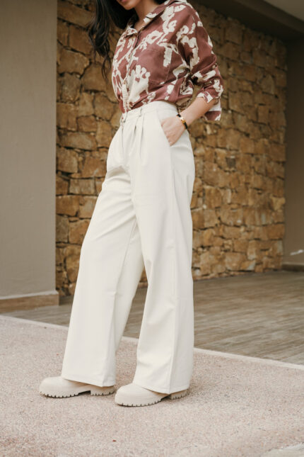 Παντελόνι δερματίνη καφέ σε στενή γραμμή με φλις επένδυση. Λεπτομέρεια με ραφές κατά μήκος του παντελονιού και σκίσιμο στο μπροστινό μέρος στο τελείωμα. Κλείνει με φερμουάρ και κουμπί μπροστά.