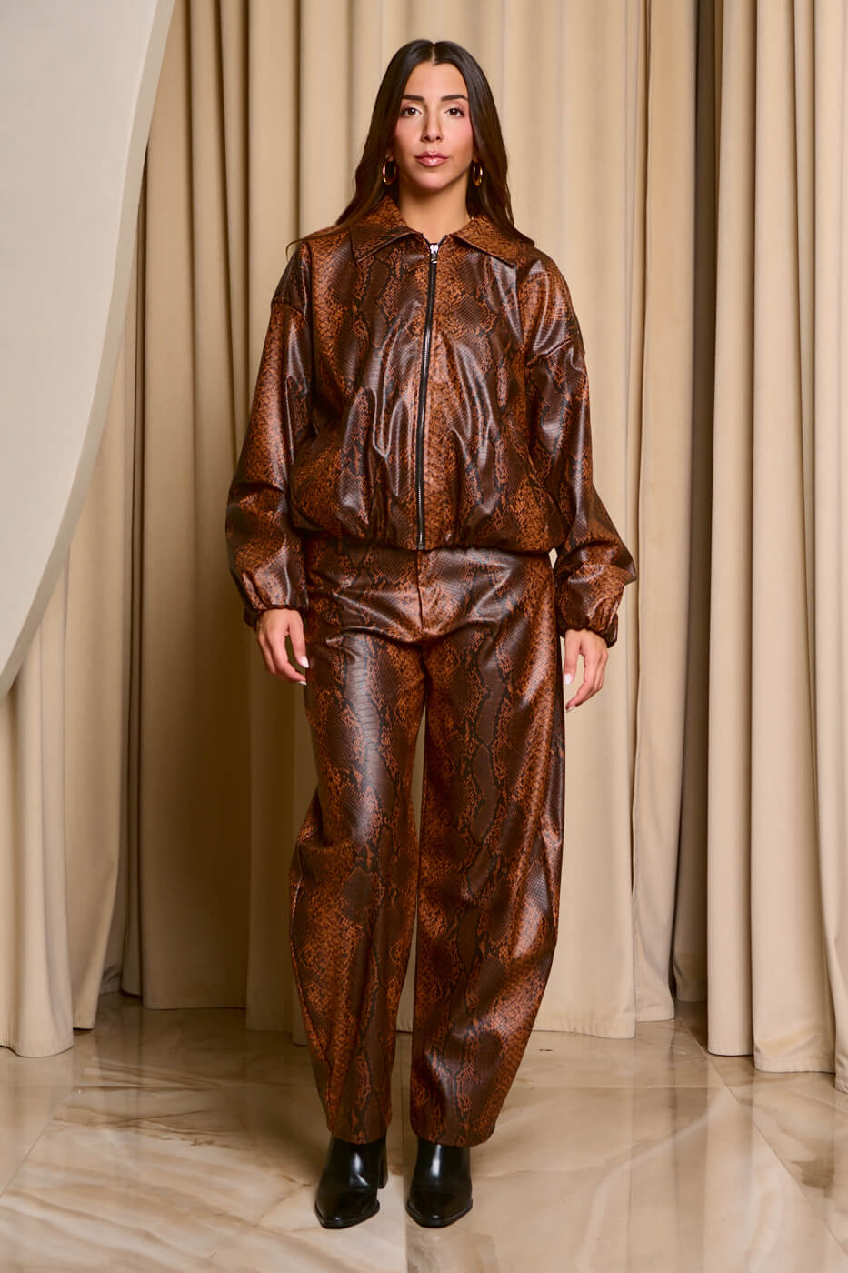 Παντελόνι με snake print και λουστρέ υφή καφέ. Το παντελόνι έχει snake print και είναι σε λουστρέ υφή με διακριτική γυαλάδα. Σε ίσια γραμμή.