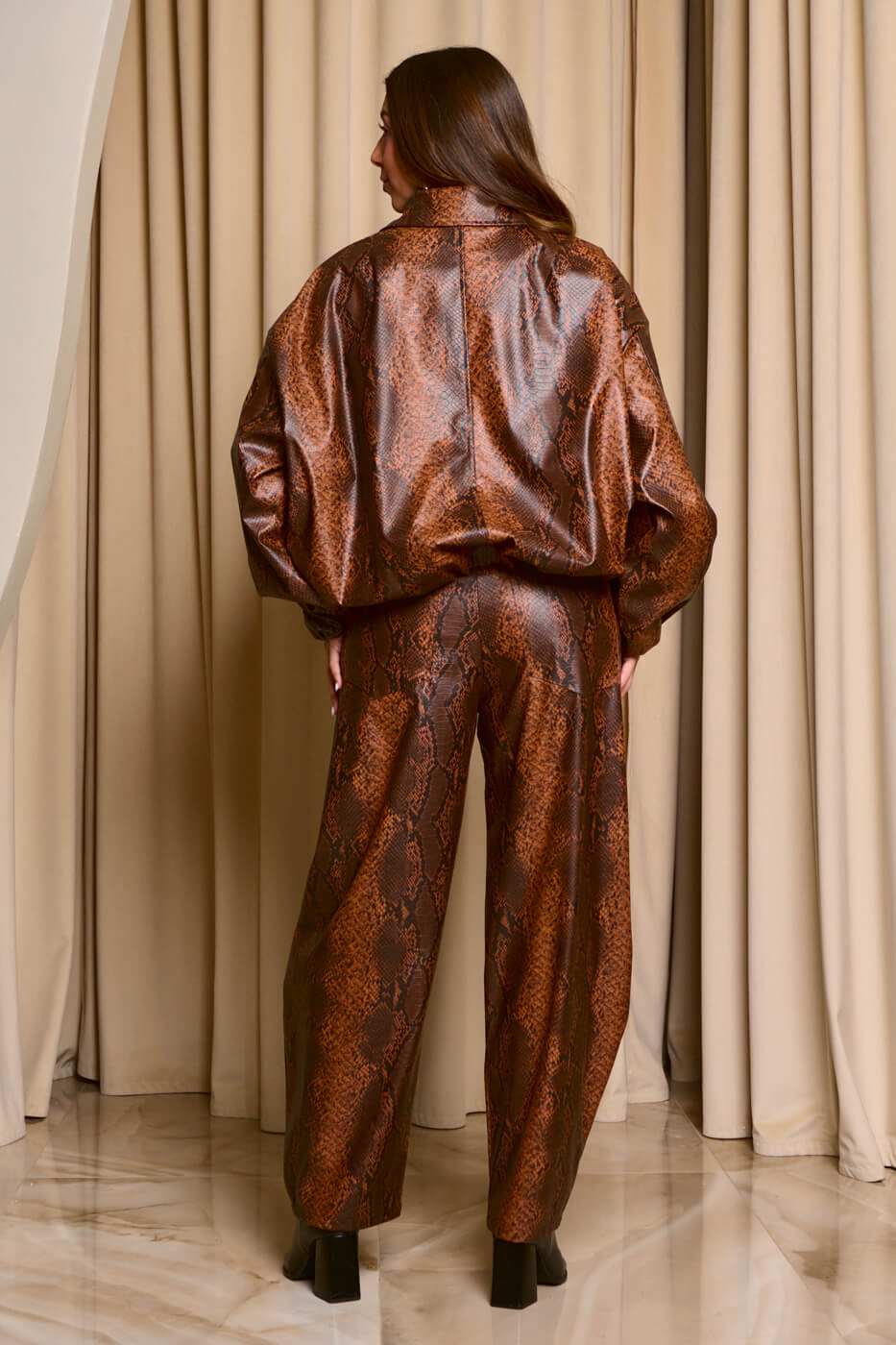 Παντελόνι με snake print και λουστρέ υφή καφέ