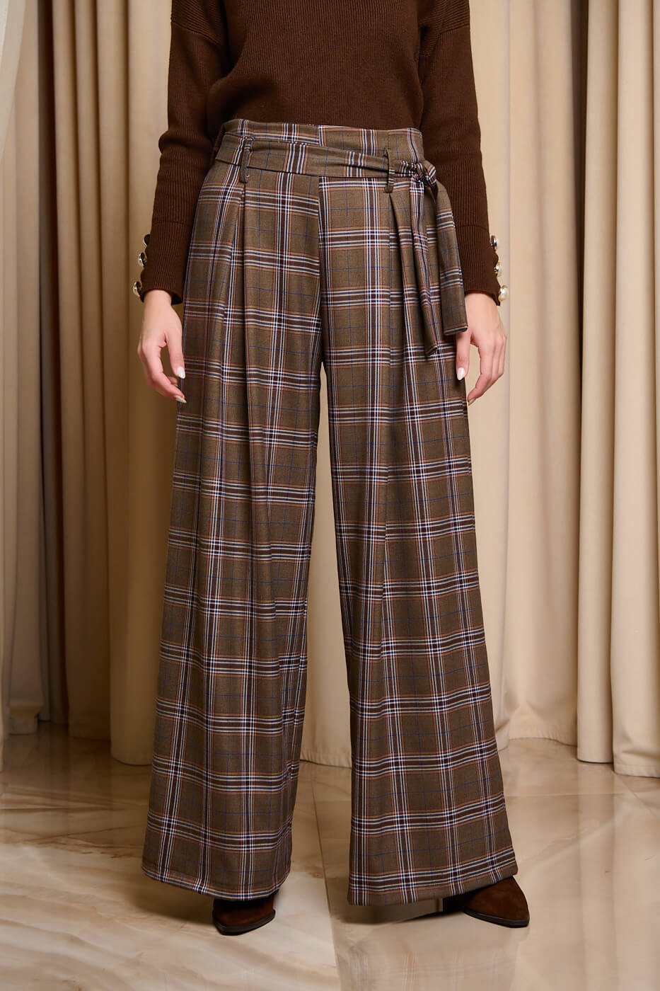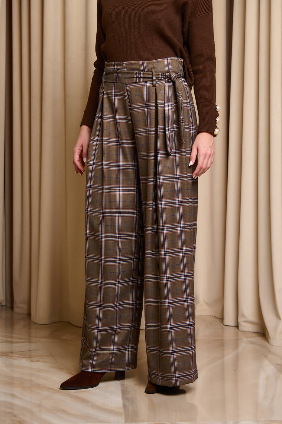 Παντελόνι ψηλόμεσο καρό με ζώνη καφέ