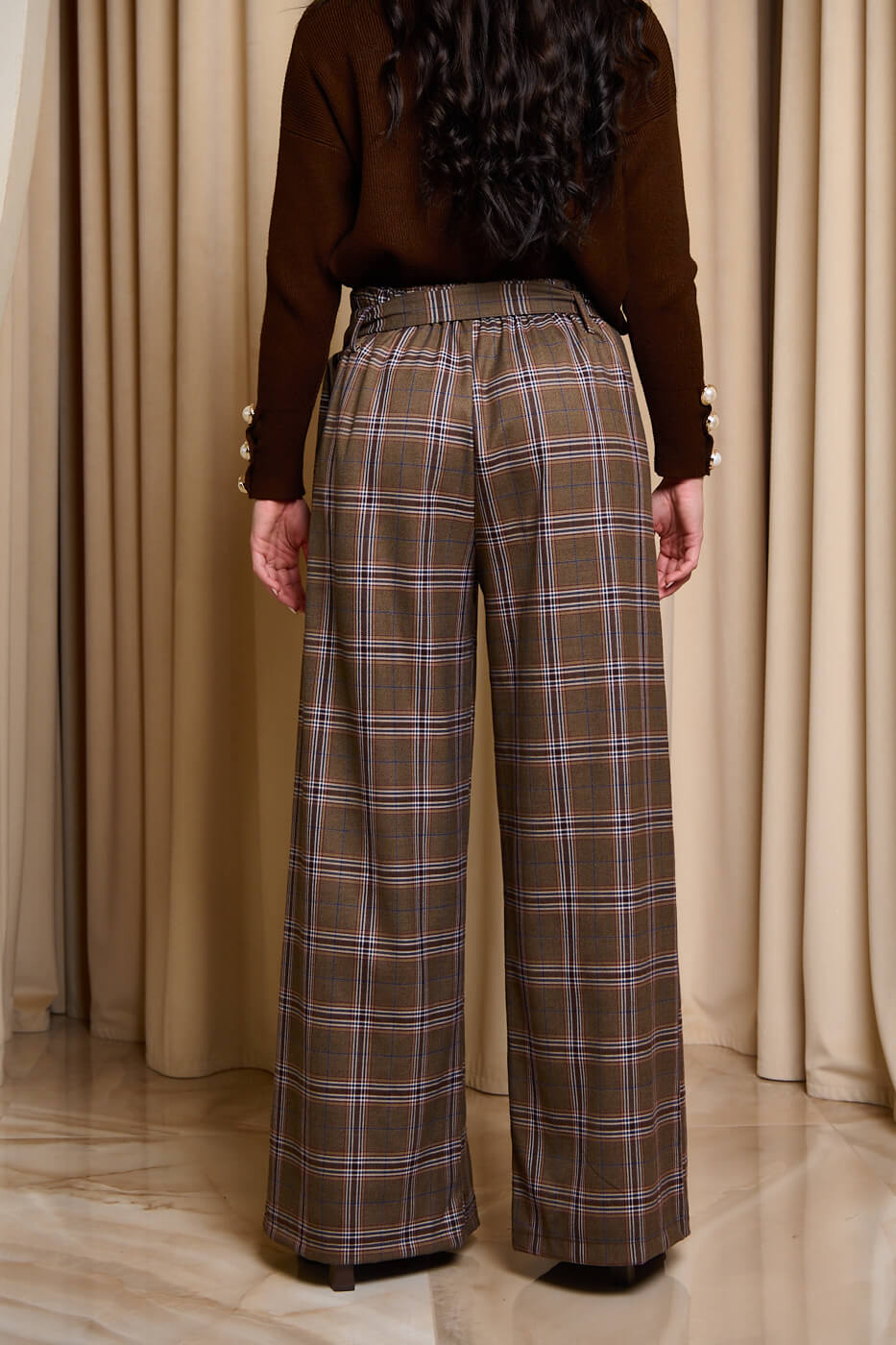 Παντελόνι ψηλόμεσο καρό με ζώνη καφέ. Ένα κομψό καρό παντελόνι σε καφέ απόχρωση με βουργουνδί και σκούρες μπλε λεπτομέρειες. Η ψηλόμεση και ίσια γραμμή του προσφέρει άνεση και στυλ. Διαθέτει δική του αποσπώμενη ζώνη και λάστιχο στη μέση. Τα μπατζάκια είναι φαρδιά με πιέτες. Ιδανική επιλογή για καθημερινές προσεγμένες εμφανίσεις.
