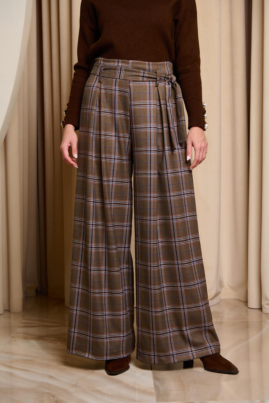 Ένα κομψό καρό παντελόνι σε καφέ απόχρωση με βουργουνδί και σκούρες μπλε λεπτομέρειες. Η ψηλόμεση και ίσια γραμμή του προσφέρει άνεση και στυλ. Διαθέτει δική του αποσπώμενη ζώνη και λάστιχο στη μέση. Τα μπατζάκια είναι φαρδιά με πιέτες.