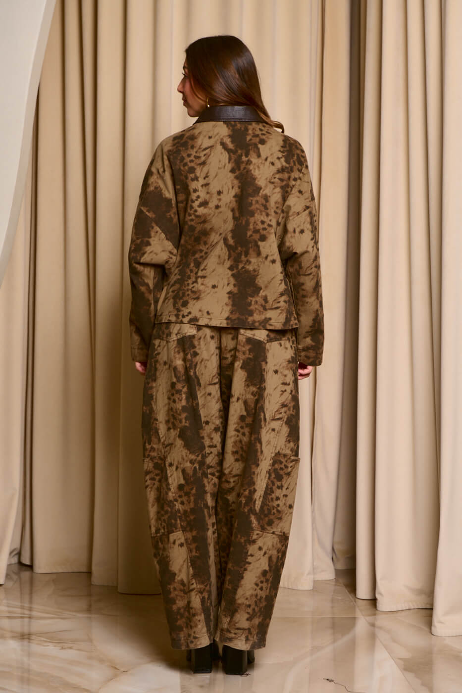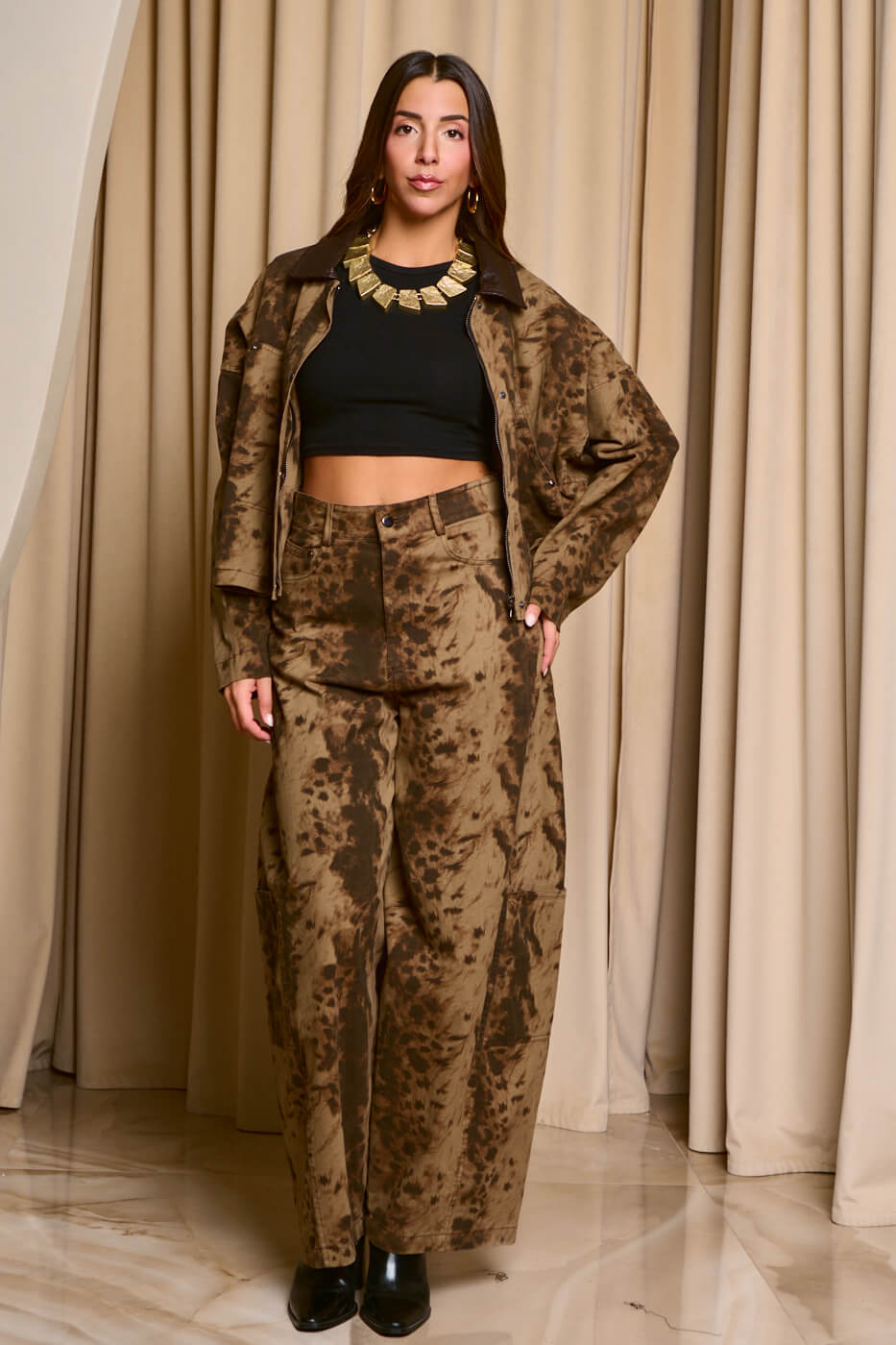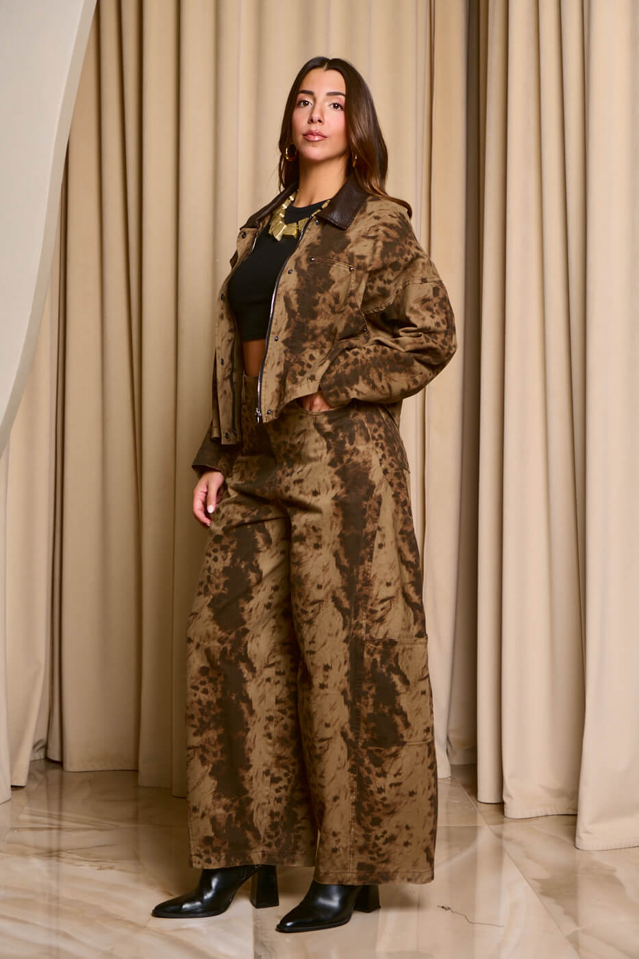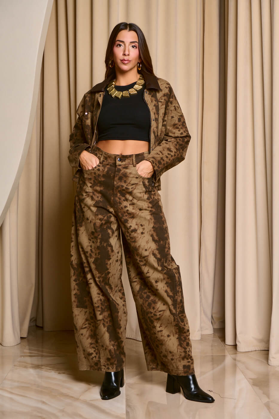 Παντελόνι σε φαρδιά γραμμή με spots καφέ. Ένα παντελόνι σε φαρδιά γραμμή, με άνετη και χαλαρή εφαρμογή, διακοσμημένο με καφέ spots που του δίνουν ξεχωριστό χαρακτήρα. Το παντελόνι είναι σε στυλ barrel, με στρογγυλεμένη φόρμα που τονίζει τη μοντέρνα γραμμή του, ενώ οι έξτρα τσέπες στη μέση προσθέτουν πρακτικότητα αλλά και ένα πιο ιδιαίτερο, fashion-forward ύφος.