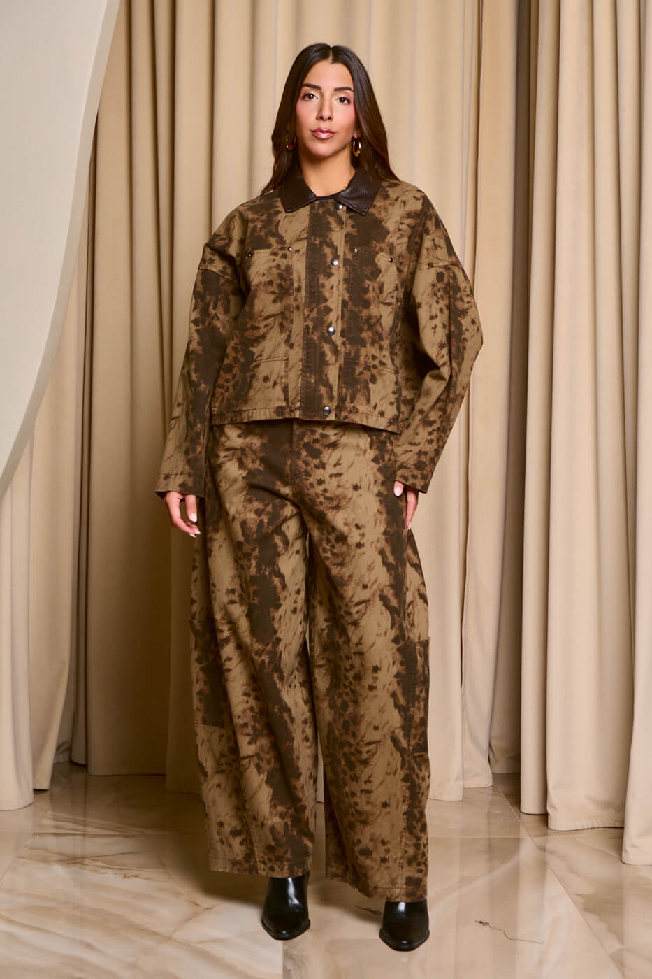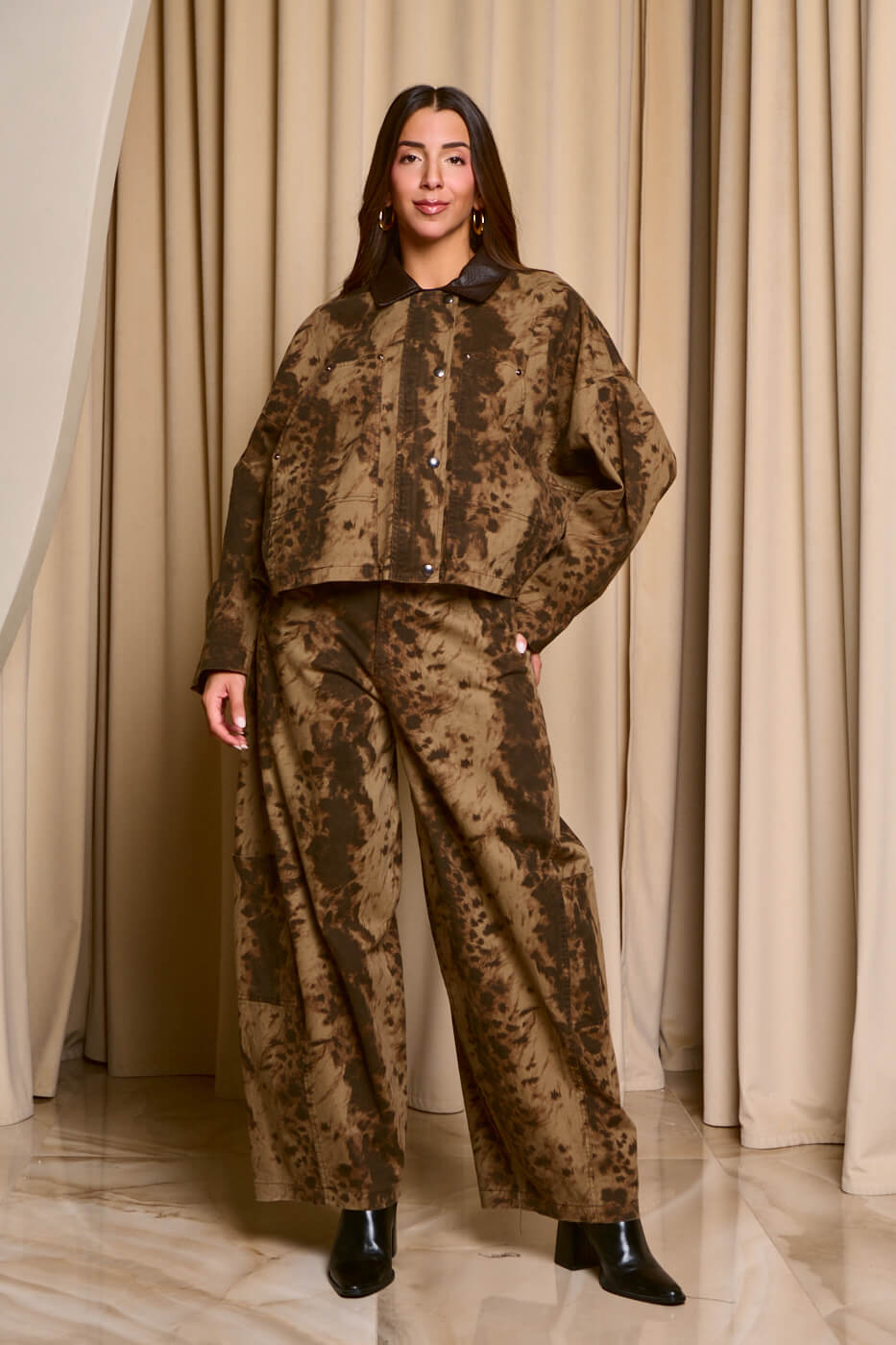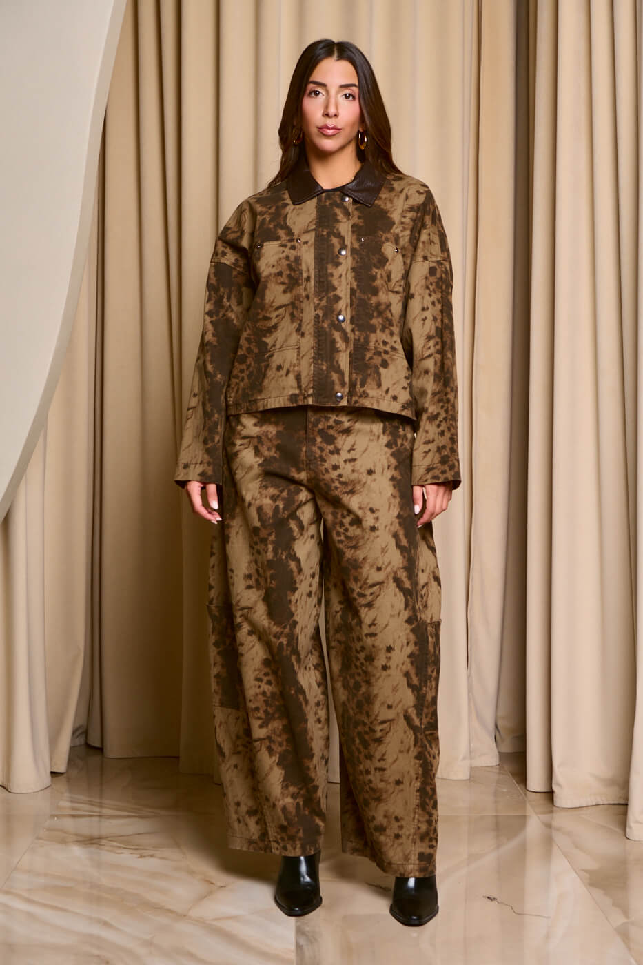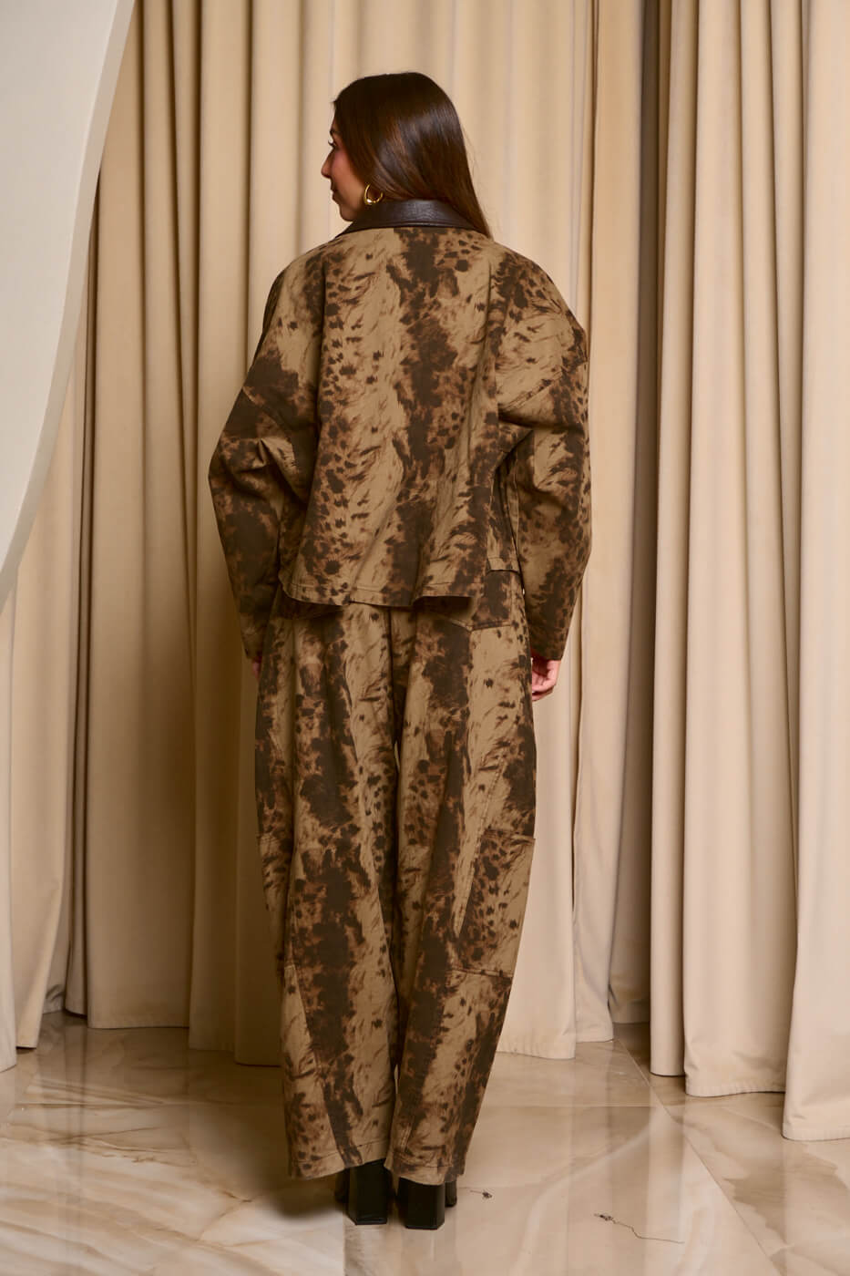 Παντελόνι σε φαρδιά γραμμή με spots καφέ. Ένα παντελόνι σε φαρδιά γραμμή, με άνετη και χαλαρή εφαρμογή, διακοσμημένο με καφέ spots που του δίνουν ξεχωριστό χαρακτήρα. Το παντελόνι είναι σε στυλ barrel, με στρογγυλεμένη φόρμα που τονίζει τη μοντέρνα γραμμή του, ενώ οι έξτρα τσέπες στη μέση προσθέτουν πρακτικότητα αλλά και ένα πιο ιδιαίτερο, fashion-forward ύφος.