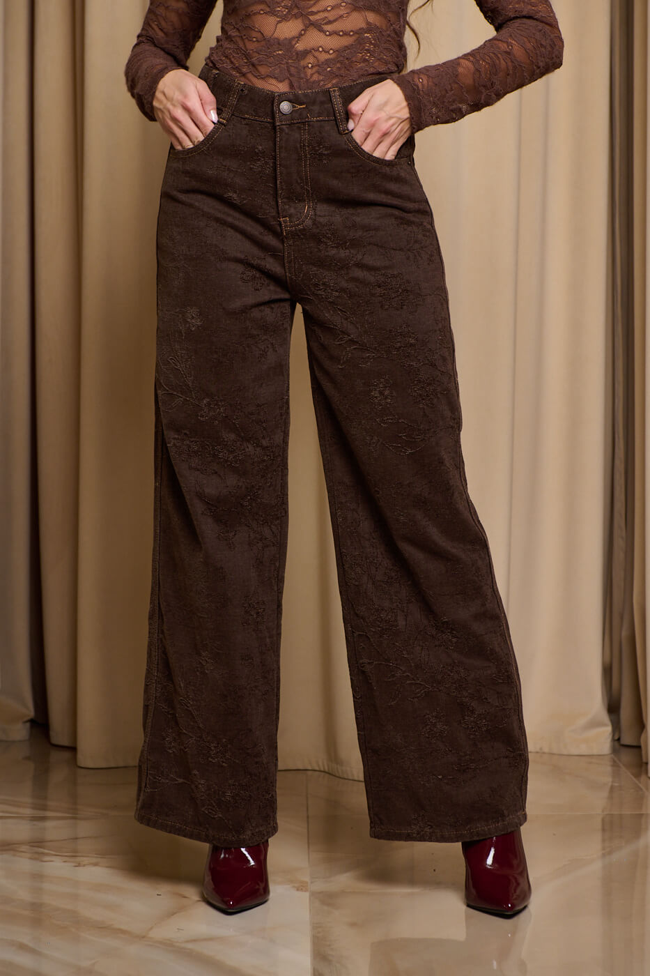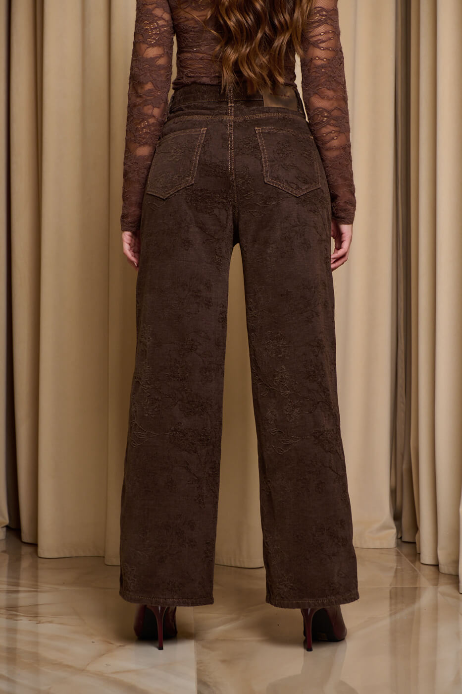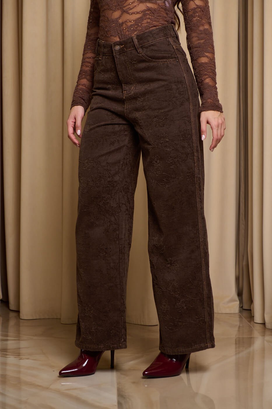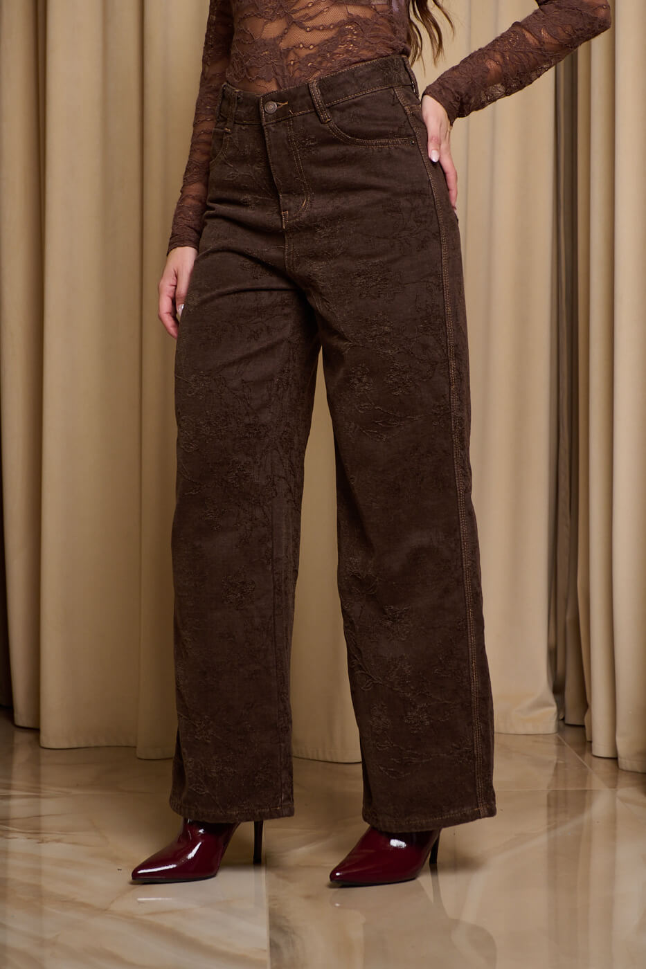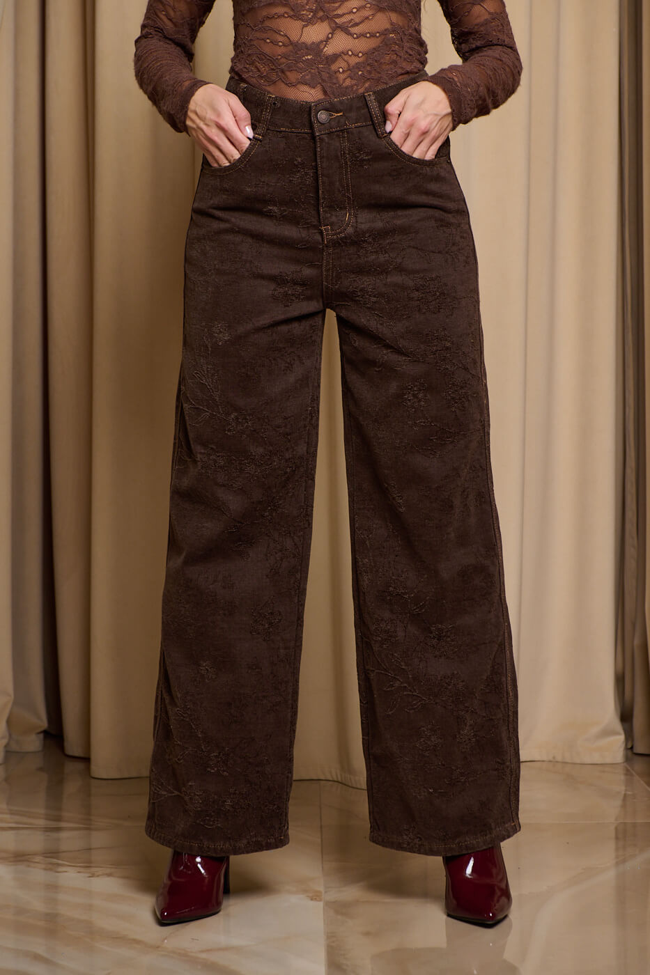 Παντελόνι τζιν με ανάγλυφο velvet print καφέ. Ένα εντυπωσιακό ψηλόμεσο τζιν σε ίσια γραμμή. Διαθέτει ανάγλυφό floral σχέδιο στον ίδιο χρωματικό τόνο και τσέπες μπροστά και πίσω. Κλείνει με φερμουάρ και κουμπί μπροστά.
