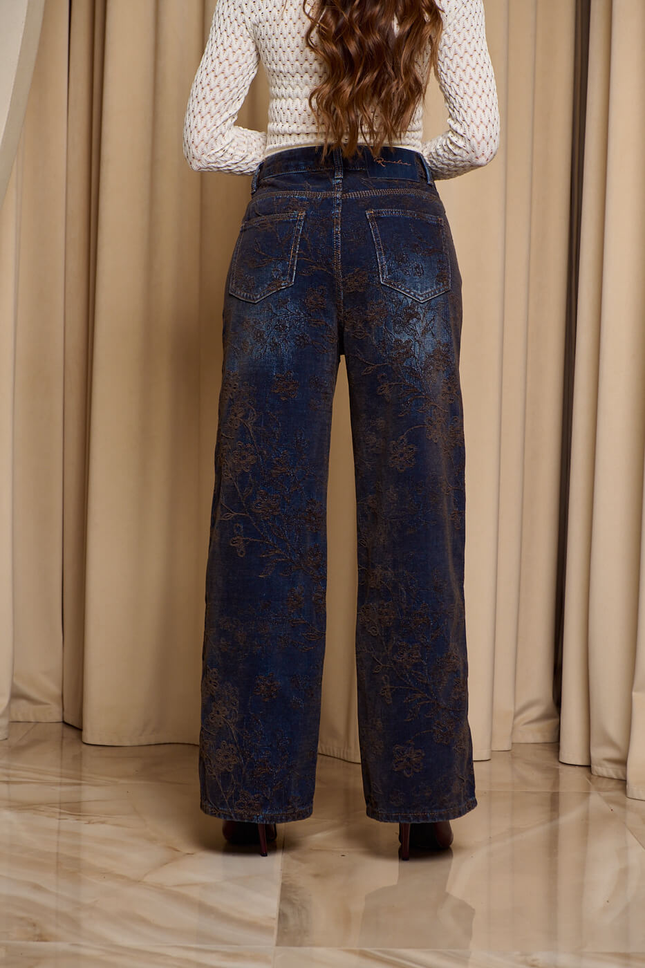 Παντελόνι τζιν με ανάγλυφο velvet print μπλε. Ένα εντυπωσιακό ψηλόμεσο τζιν σε ίσια γραμμή. Διαθέτει ανάγλυφό velvet floral σχέδιο σε καφέ απόχρωση και τσέπες μπροστά και πίσω. Κλείνει με φερμουάρ και κουμπί μπροστά.