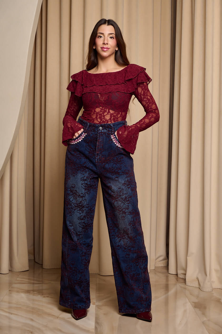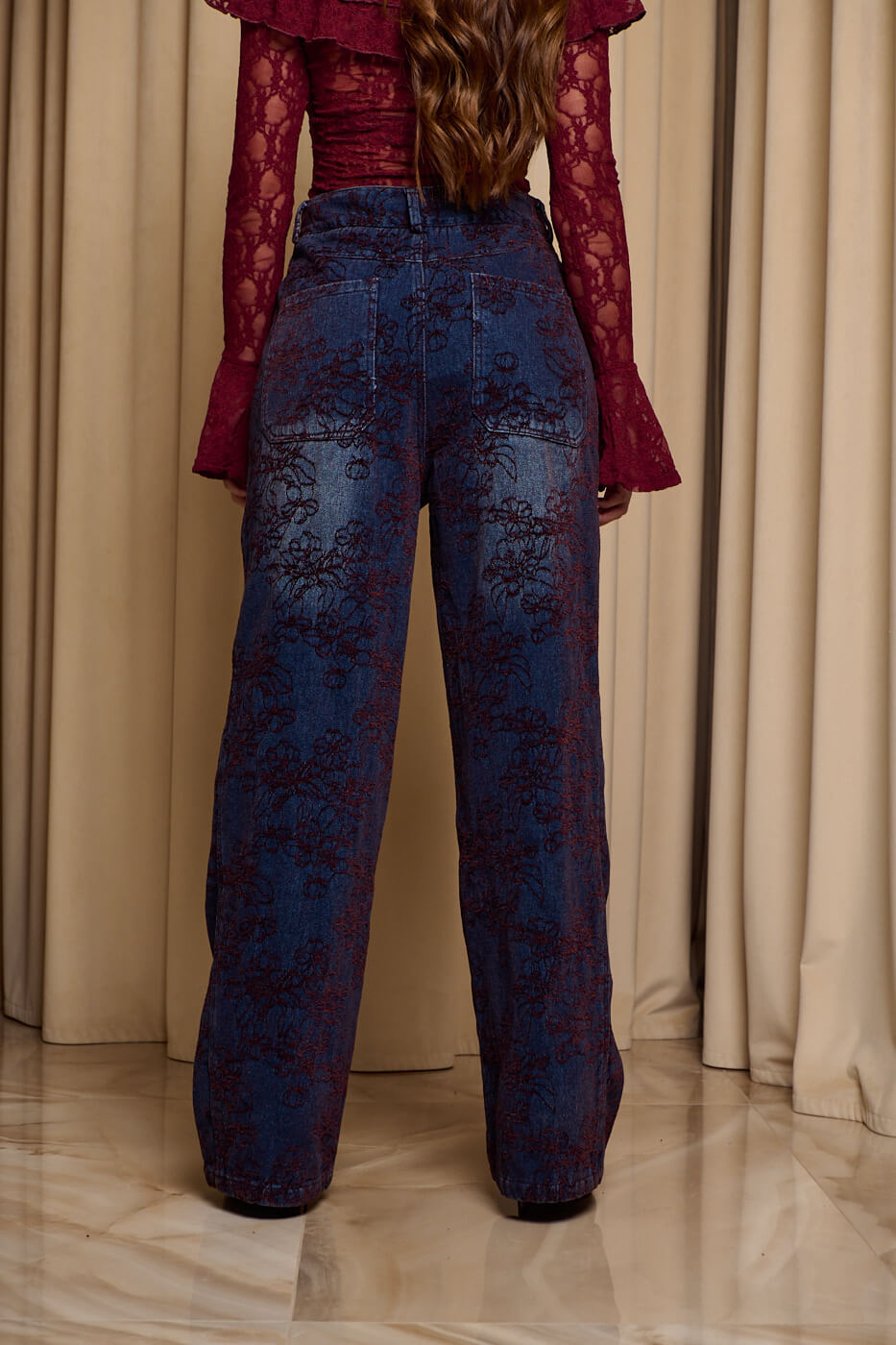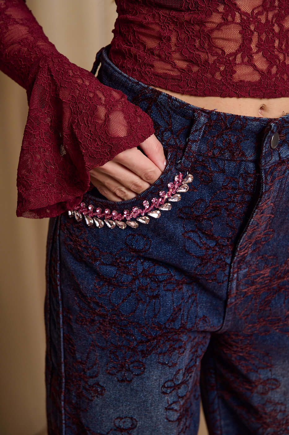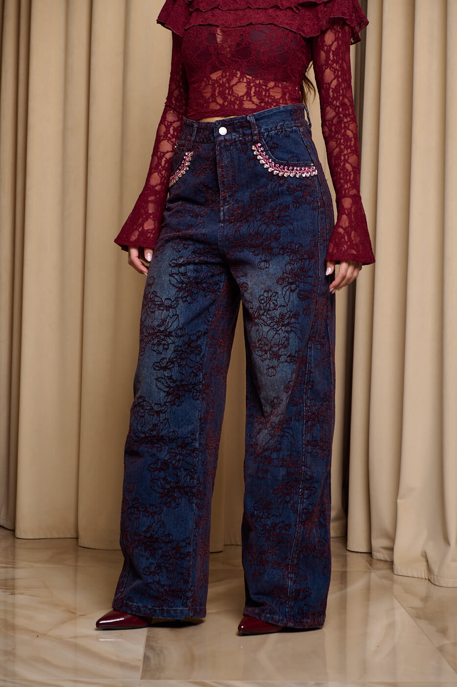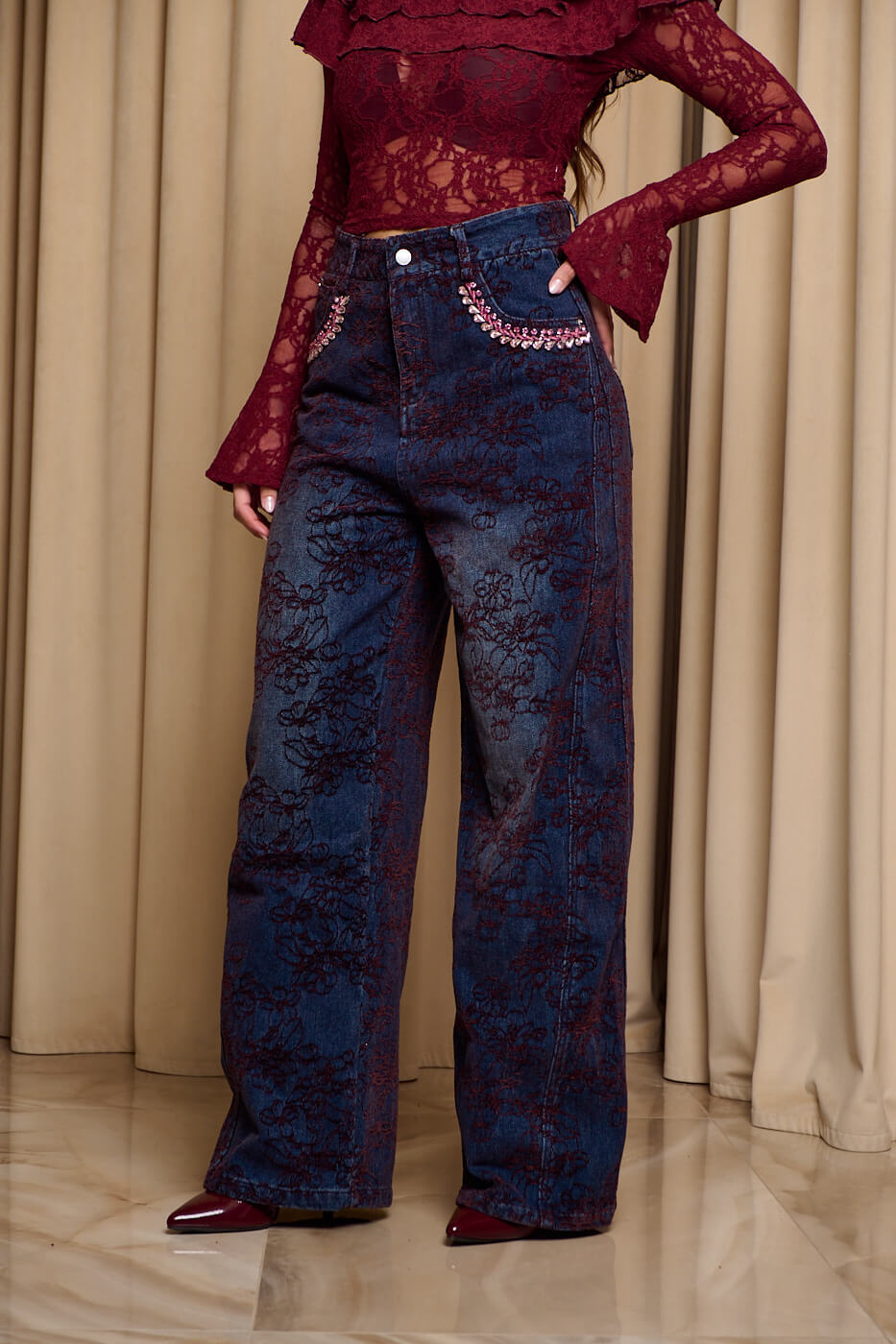 Παντελόνι τζιν με διακοσμητικές πέτρες μπλε. Διαθέτει ανάγλυφό velvet floral σχέδιο σε βουργουνδί απόχρωση. Επιπλέον, έχει τσέπες με διακοσμητικές πέτρες και χάντρες σε ροζ αποχρώσεις. Έχει θυλήκια για να μπορεί να μπει ζώνη. Κλείνει με φερμουάρ και κουμπί μπροστά.