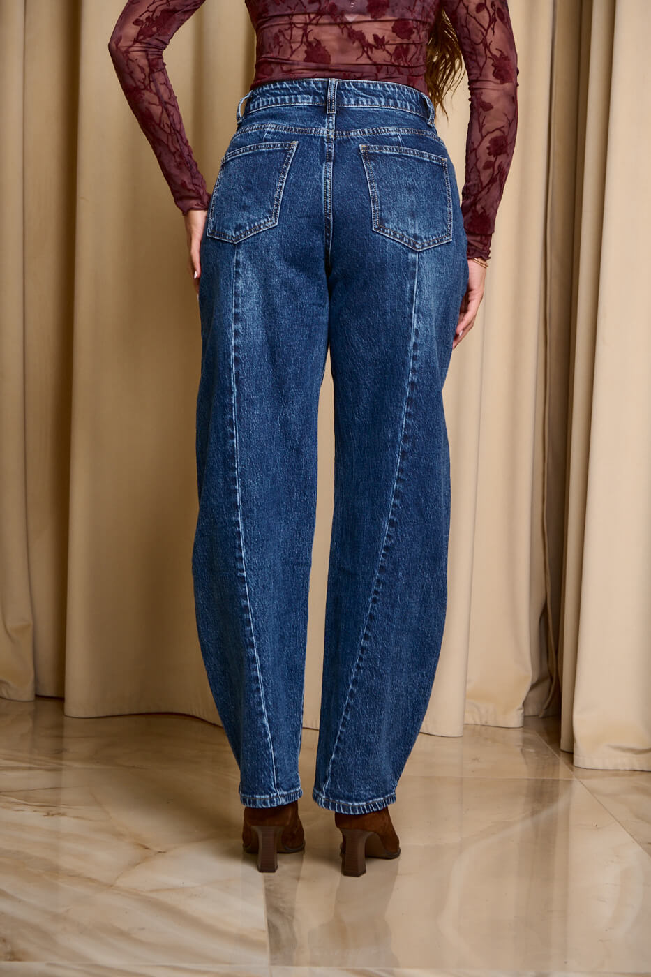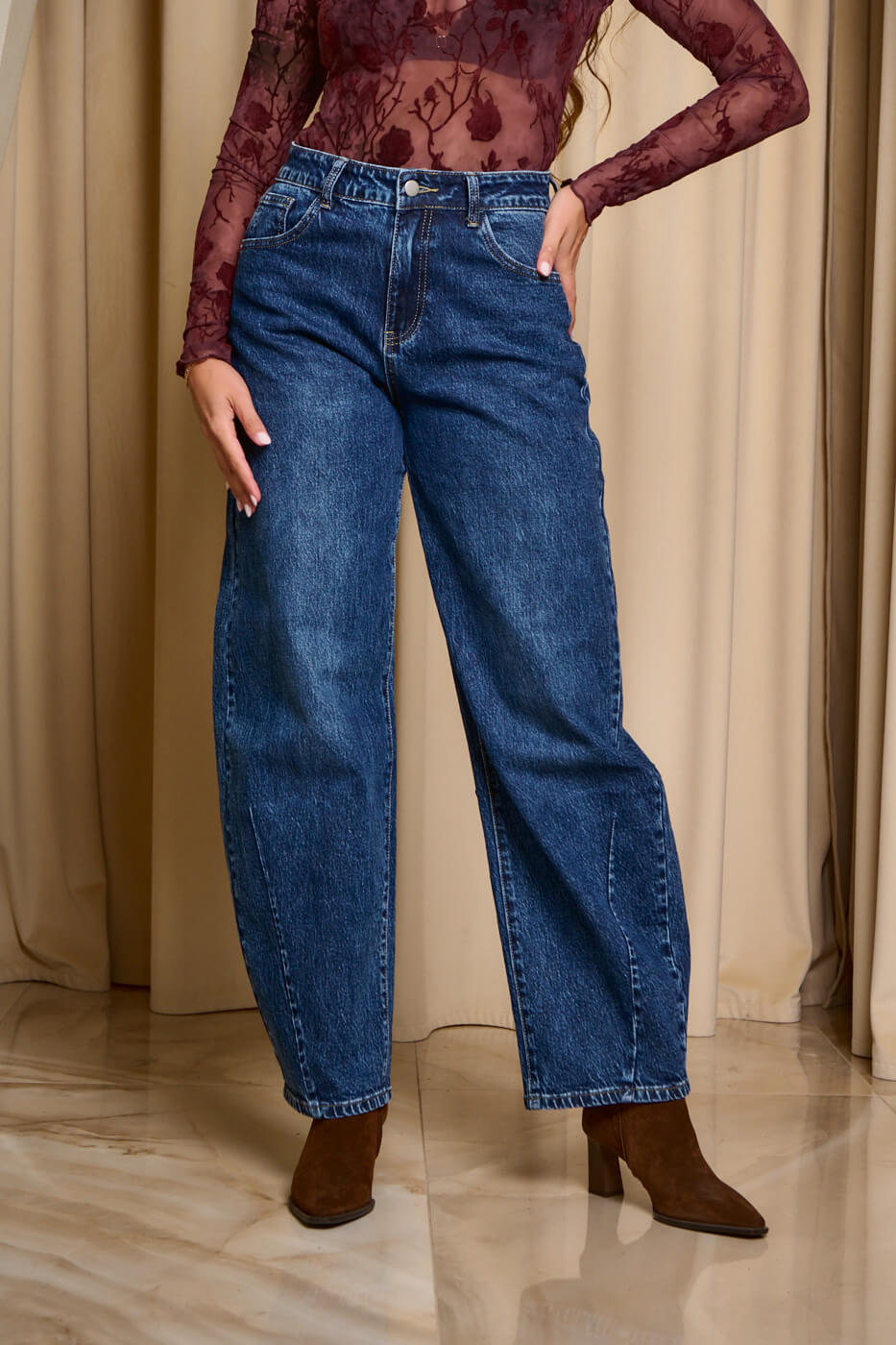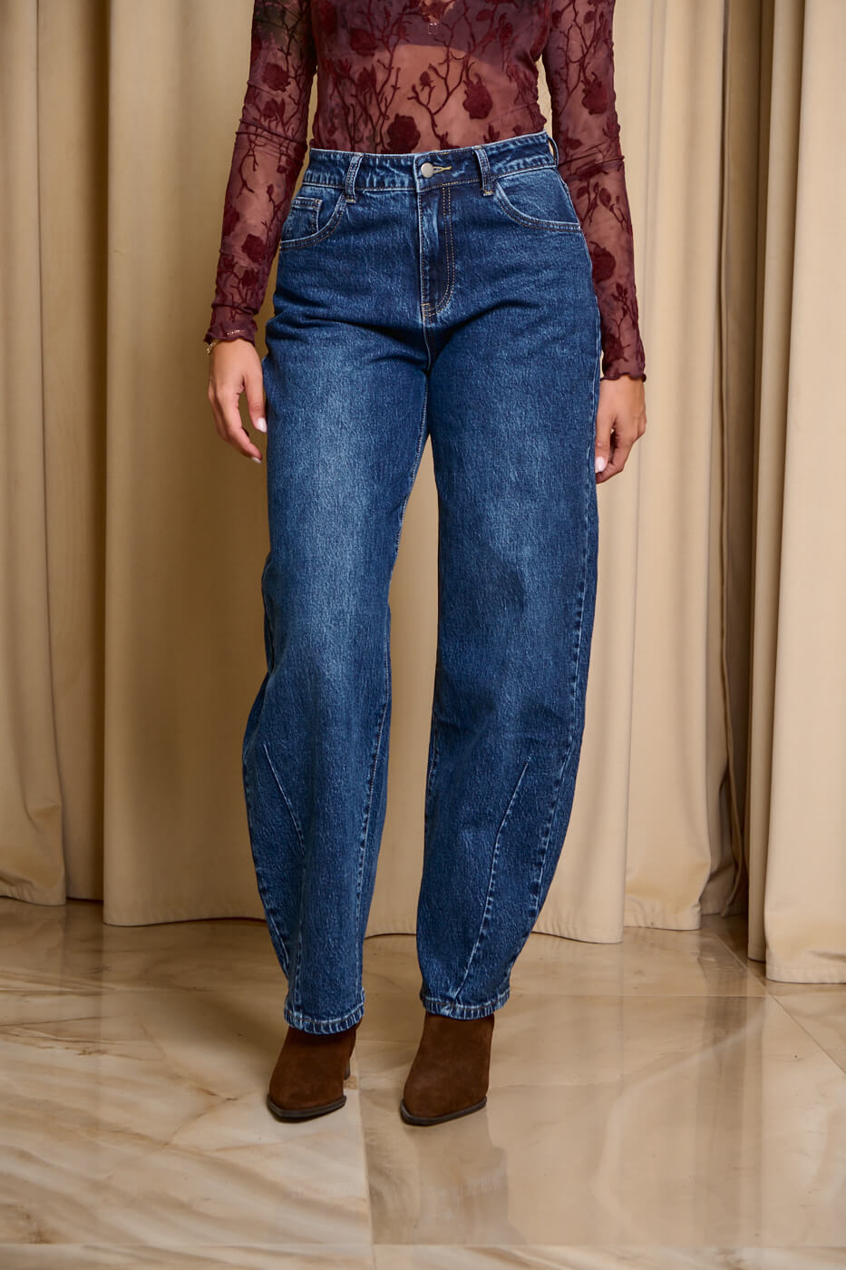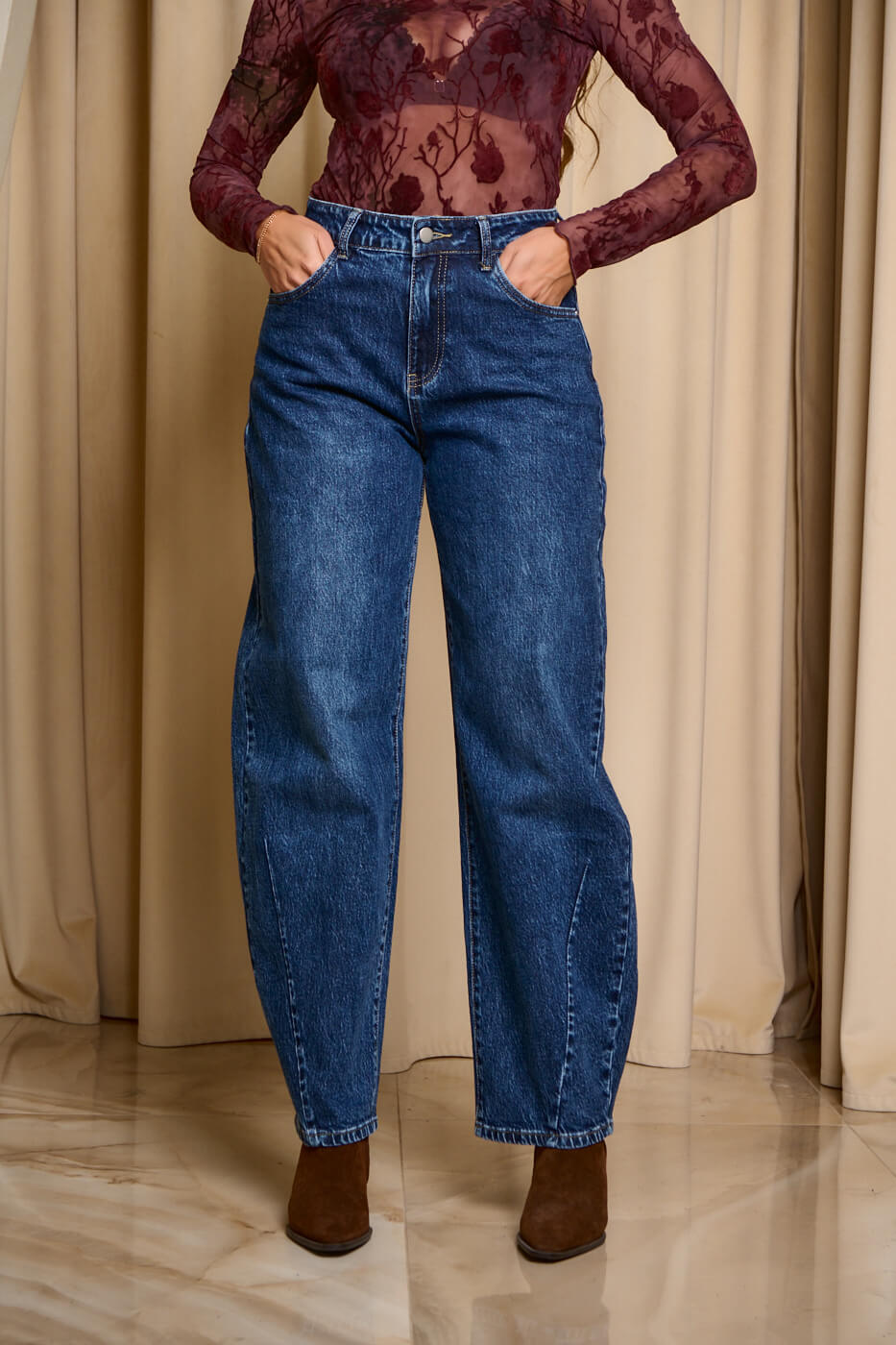 Παντελόνι τζιν σκούρο μπλε balloon. Kλείνει μπροστά με κουμπί και φερμουάρ. Σε γραμμή balloon και σκούρο μπλε σε απόχρωση. Διαθέτει τσέπες στο πίσω και μπροστινό μέρος.