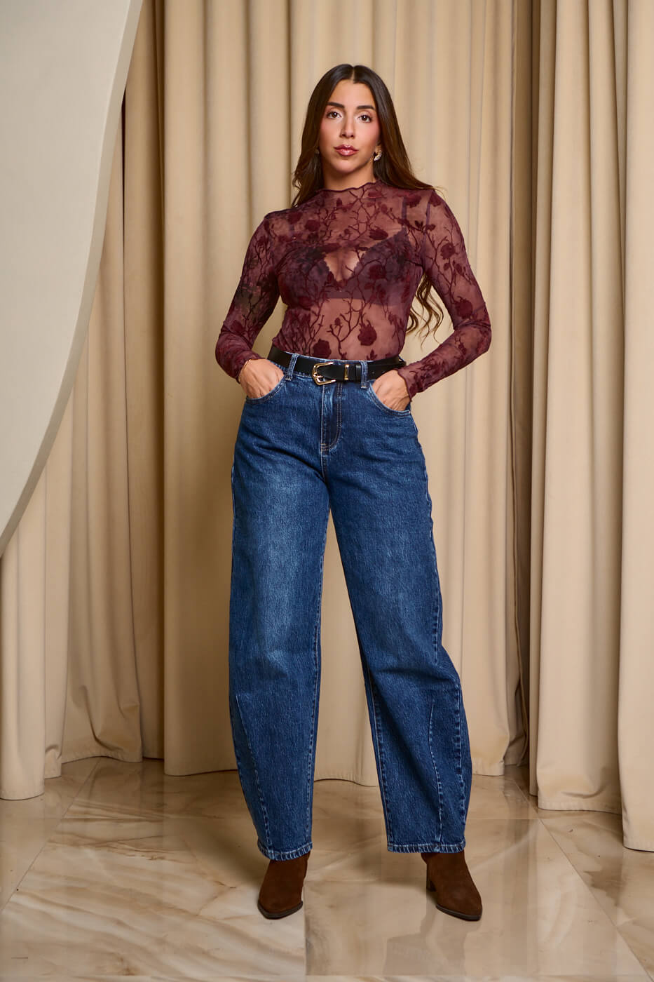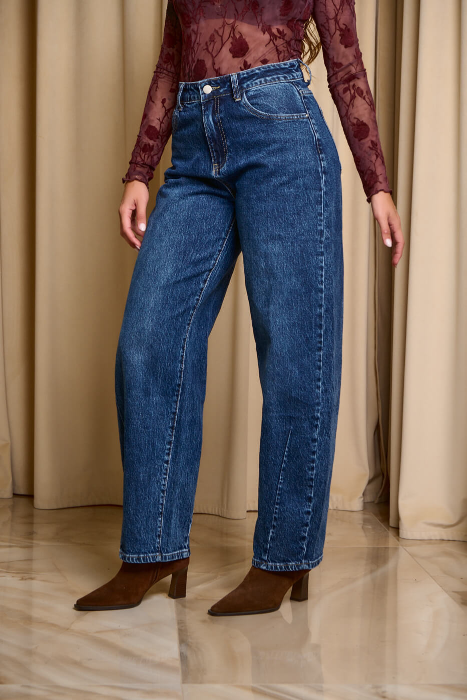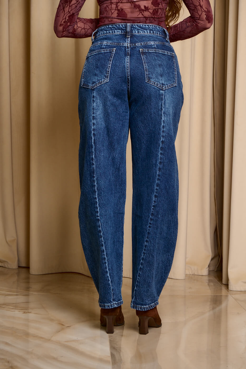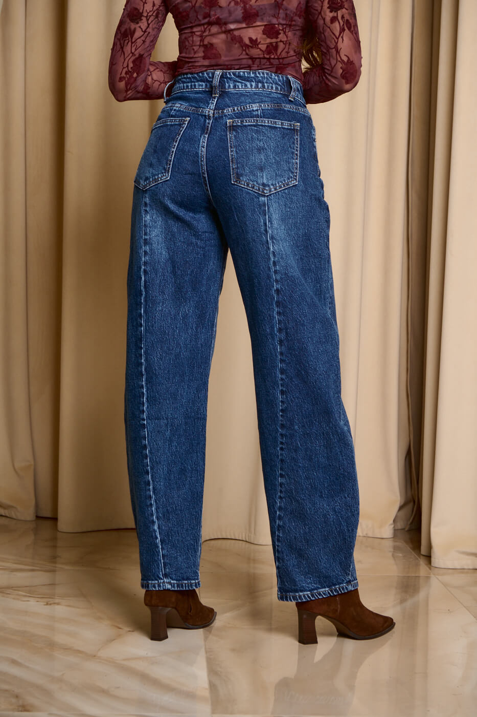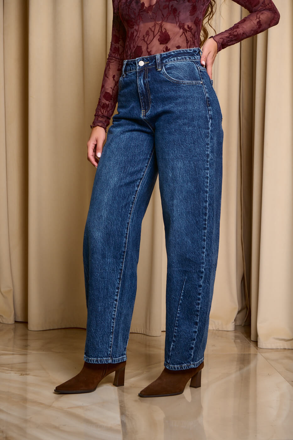 Παντελόνι τζιν σκούρο μπλε balloon. Kλείνει μπροστά με κουμπί και φερμουάρ. Σε γραμμή balloon και σκούρο μπλε σε απόχρωση. Διαθέτει τσέπες στο πίσω και μπροστινό μέρος.