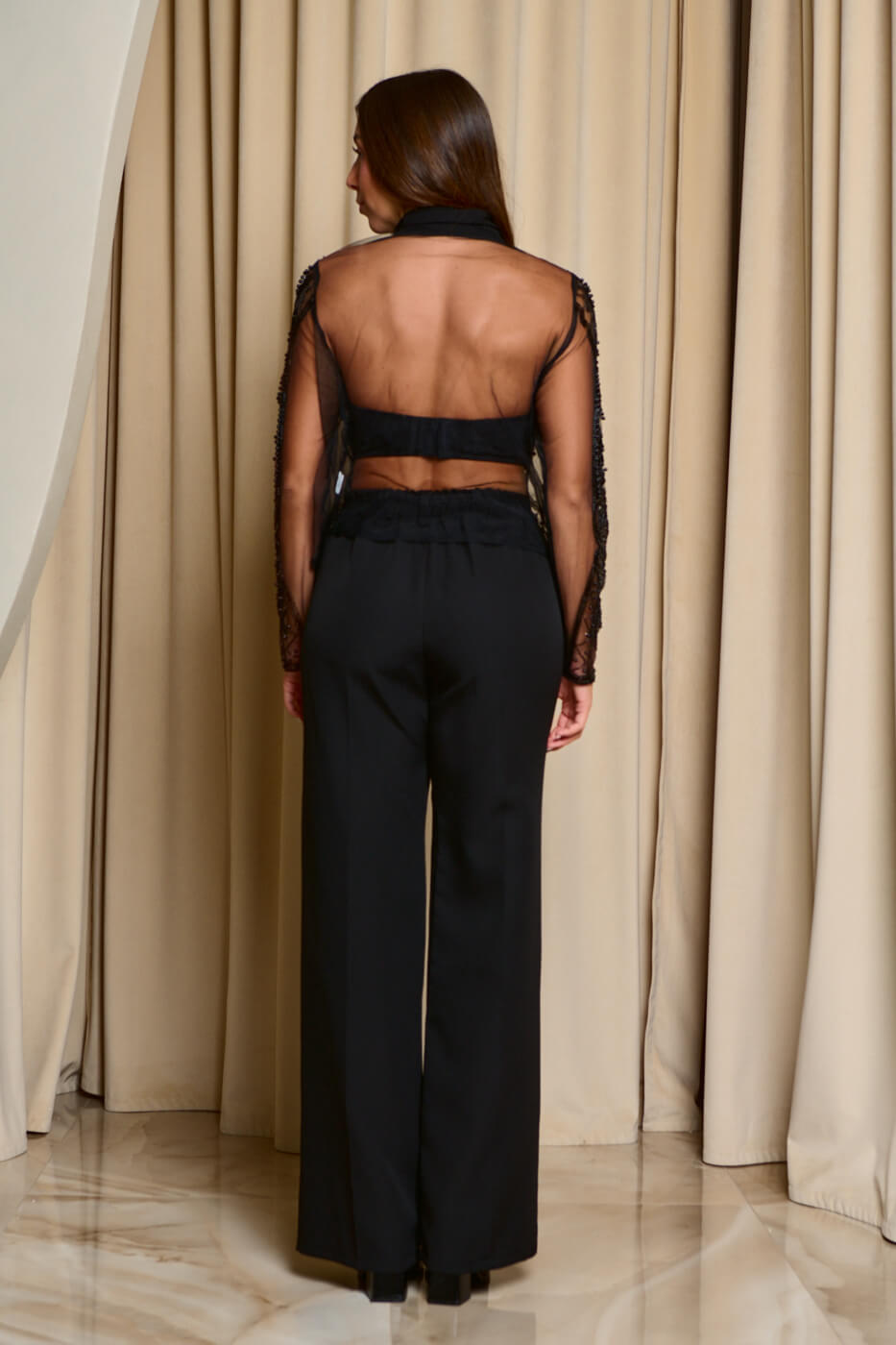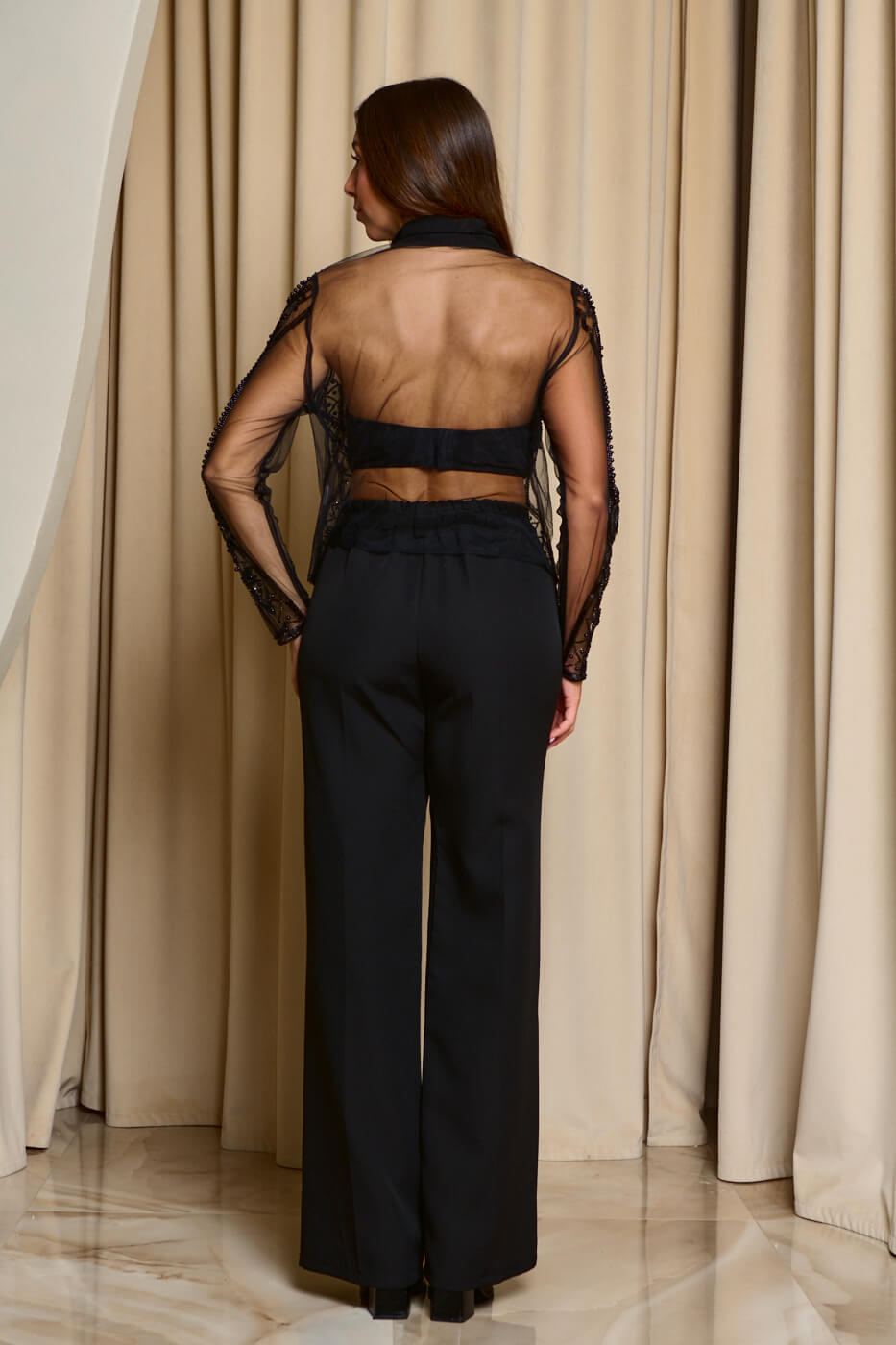 Πουκάμισο διαφάνεια με παγιέτες και χάντρες μαύρο. Διαθέτει σχέδιο με χάντρες και παγιέτες σε όλη του την επιφάνεια, είναι see through και κλείνει με μαύρα κουμπιά. Ένα πουκάμισο εντυπωσιακό για βραδινές εμφανίσεις.