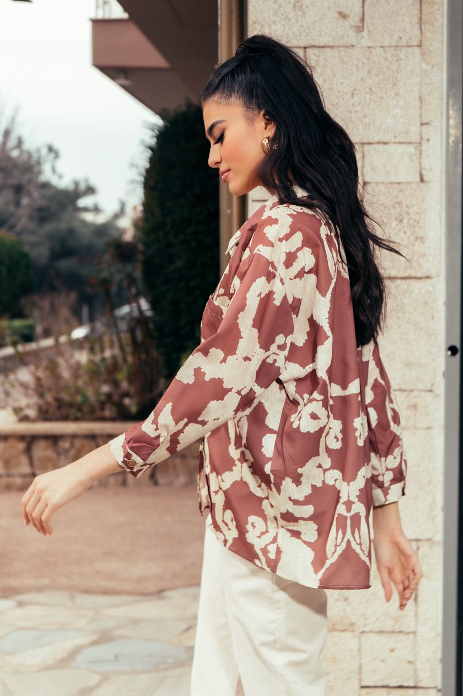 Πουκάμισο εμπριμέ καφέ σκούρο μπεζ, με πέτο γιακά και μακριά μανίκια με στενή μανσέτα στο τελείωμα. Διαθέτει τσέπη στο στήθος.