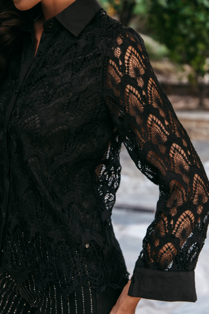 Πουκάμισο μαύρο κιπούρ, με εσωτερική φόδρα. Διαθέτει πέτο γιακά, μακριά μανίκια με μανσέτα και κουμπί. Κλείνει με κουμπιά από πάνω μέχρι κάτω. Κατάλληλο για απογευματινές αλλά και βραδινές εμφανίσεις.