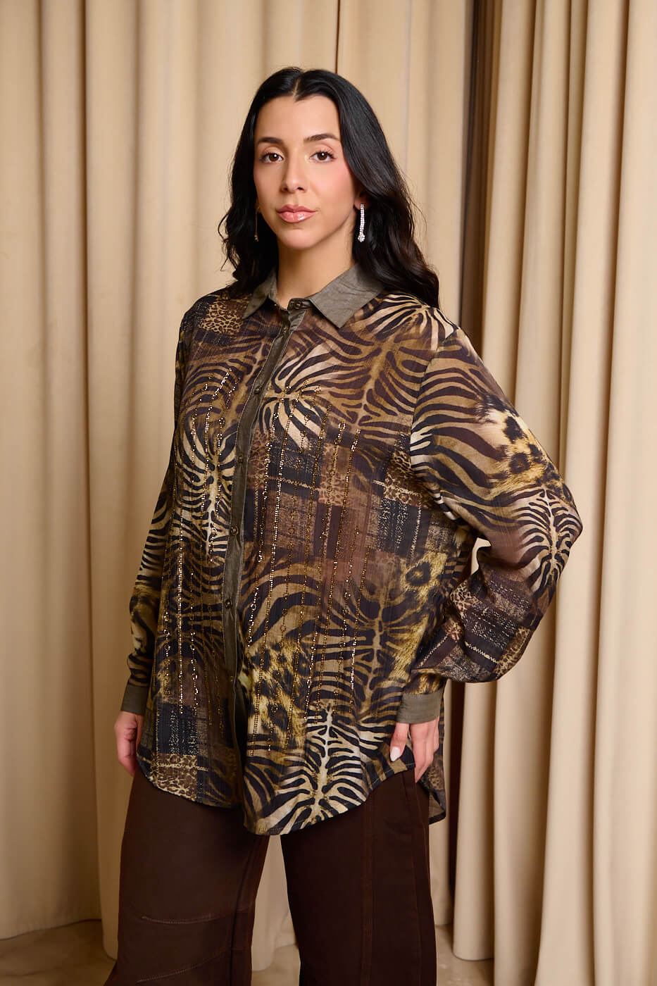 Πουκάμισο με animal print και σειρές από χρυσά στρας χακί . Ένα πουκάμισο see through με animal print σχέδιο σε όλη την επιφάνεια και στο μπροστά μέρος κάθετες σειρές από χρυσά στρας. Κλείνει με καφέ κουμπιά από πάνω μέχρι κάτω. Διαθέτει πέτο γιακά και μακριά μανίκια.