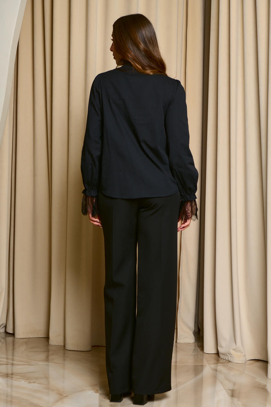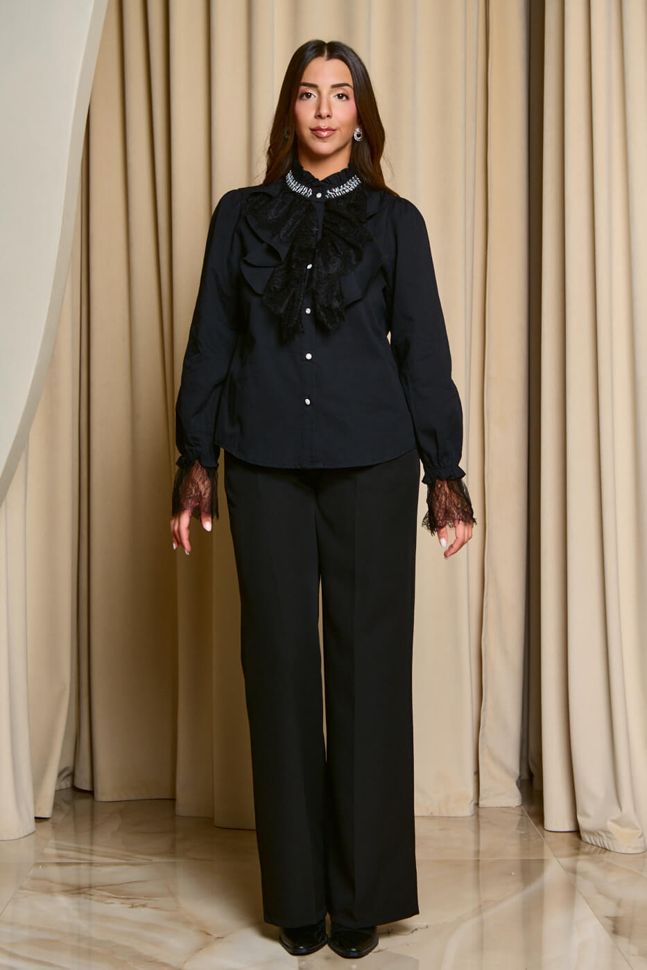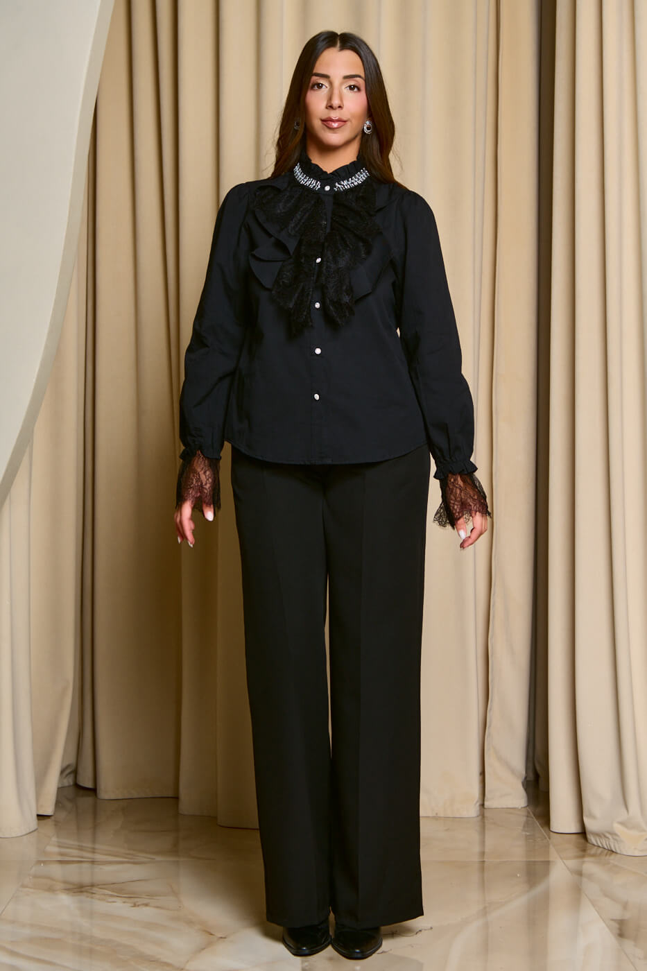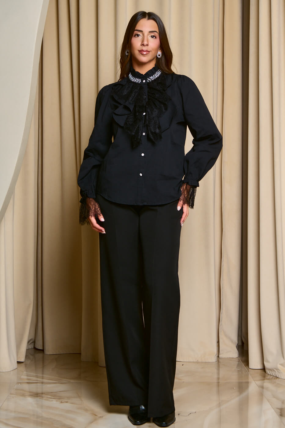 Πουκάμισο με φραμπαλά δαντέλα και χάντρες μαύρο. Σχέδιο φραμπαλά στο μπούστο με δαντέλα και χάντρες στον λαιμό. Τα μακριά μανίκια τελειώνουν με λάστιχο και συνεχίζουν με σχέδιο από δαντέλα. Κλείνει με κουμπιά κόσμημα και έχει στρογγυλή λαιμόκοψη.