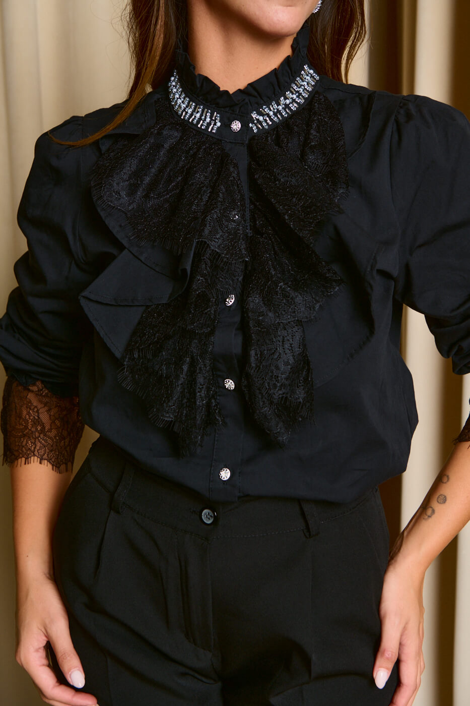 Πουκάμισο με φραμπαλά δαντέλα και χάντρες μαύρο