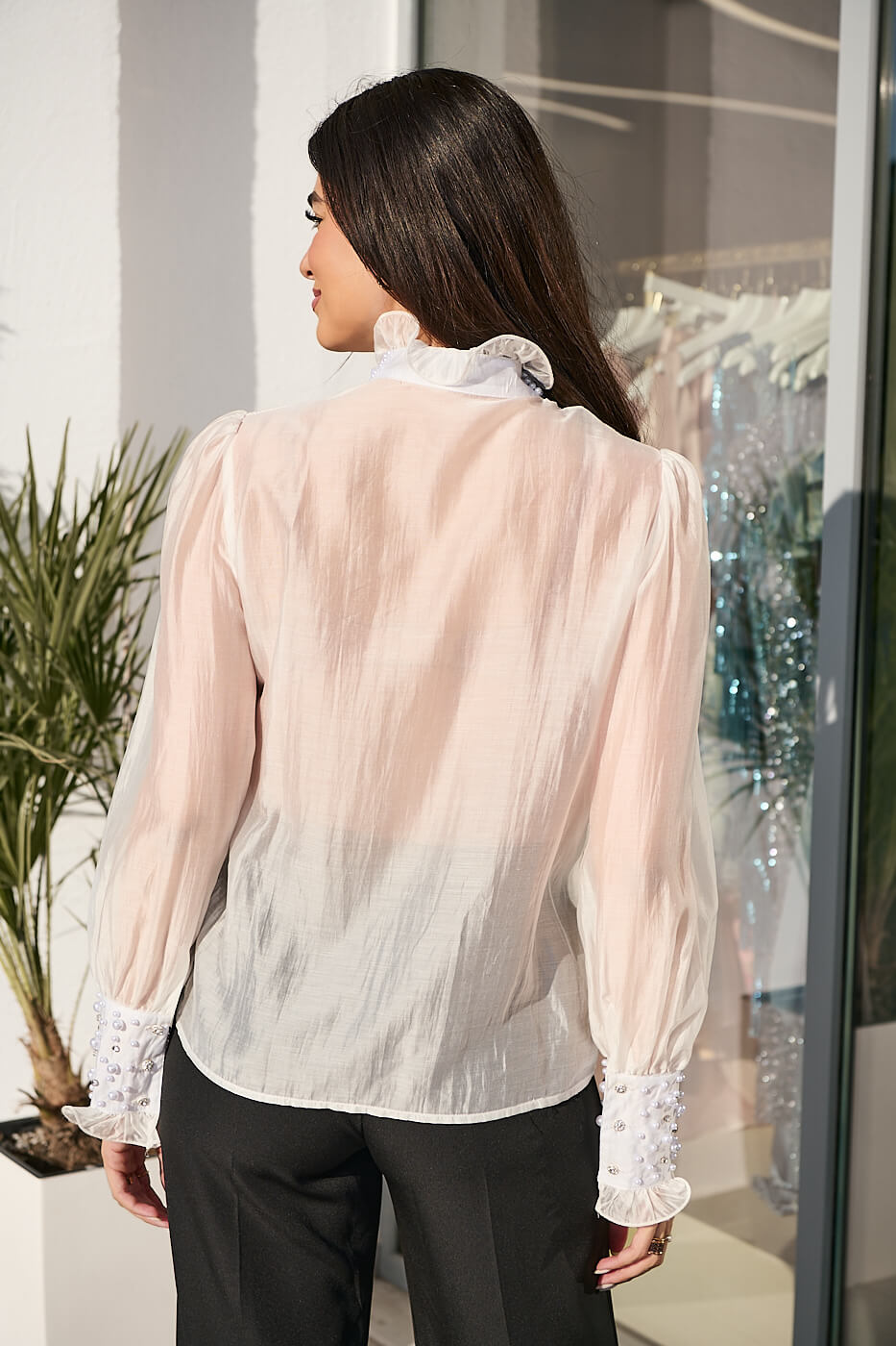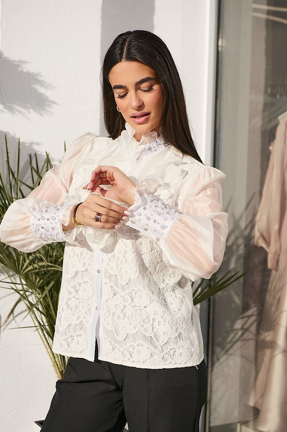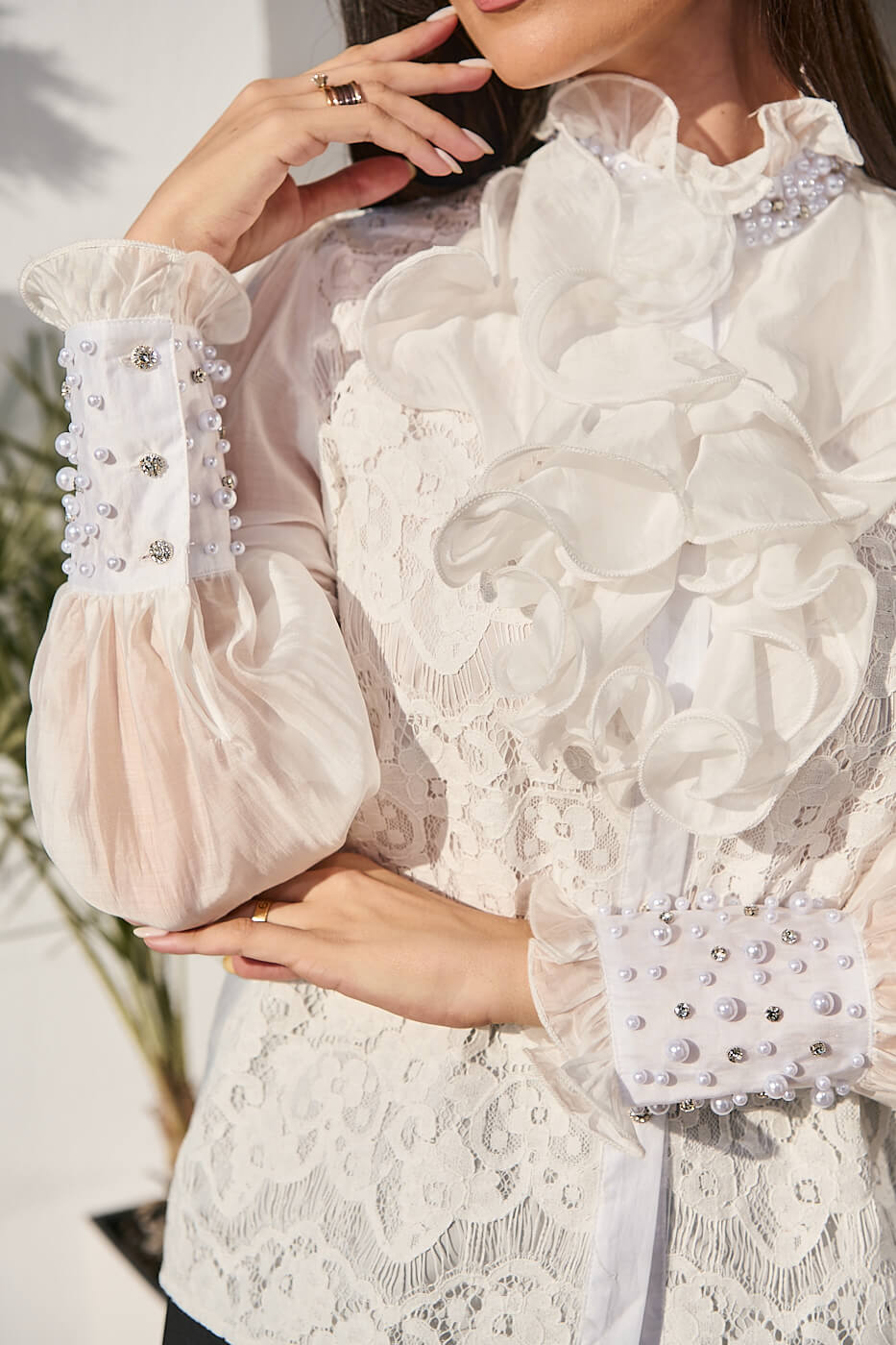 Ένα εντυπωσιακό πουκάμισο σε λευκή απόχρωση. Διαθέτει mao γιακά με βολάν και διακόσμηση από πέρλες και στρας. Το μπροστινό μέρος έχει δαντέλα με εσωτερική φόδρα και εντυπωσιακό φραμπαλά. Τα μανίκια είναι μακριά ημιδιάφανα με μεγάλη μανσέτα διακοσμημένη με πέρλες και στρας και βολάν στο τελείωμα. Το πίσω μέρος είναι see through. Κλείνει με κουμπιά στρας μπροστά και διαθέτει αποσπώμενη καρφίτσα λουλούδι.
