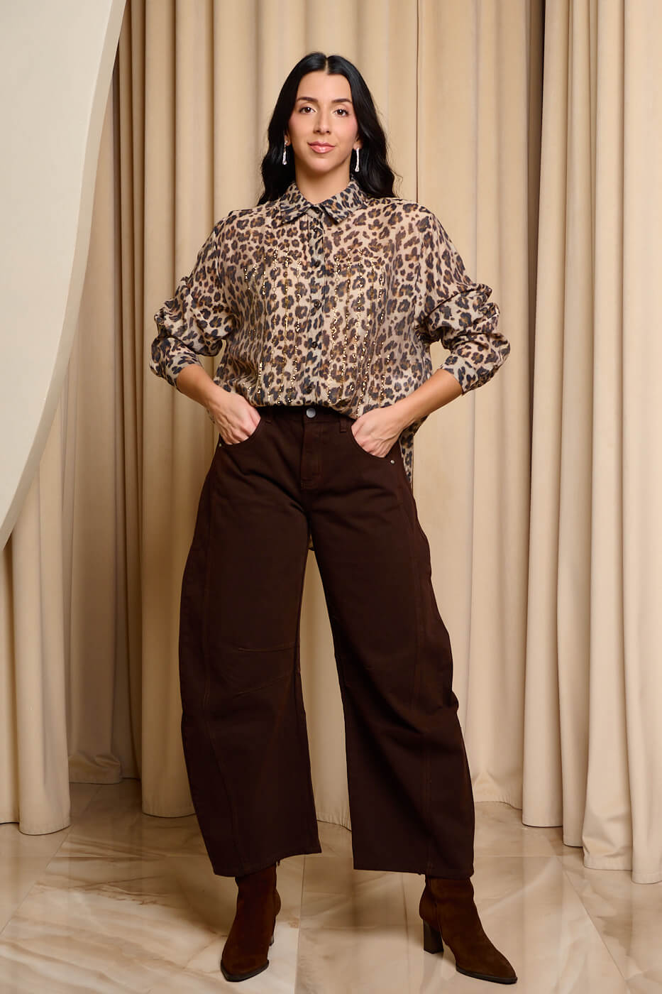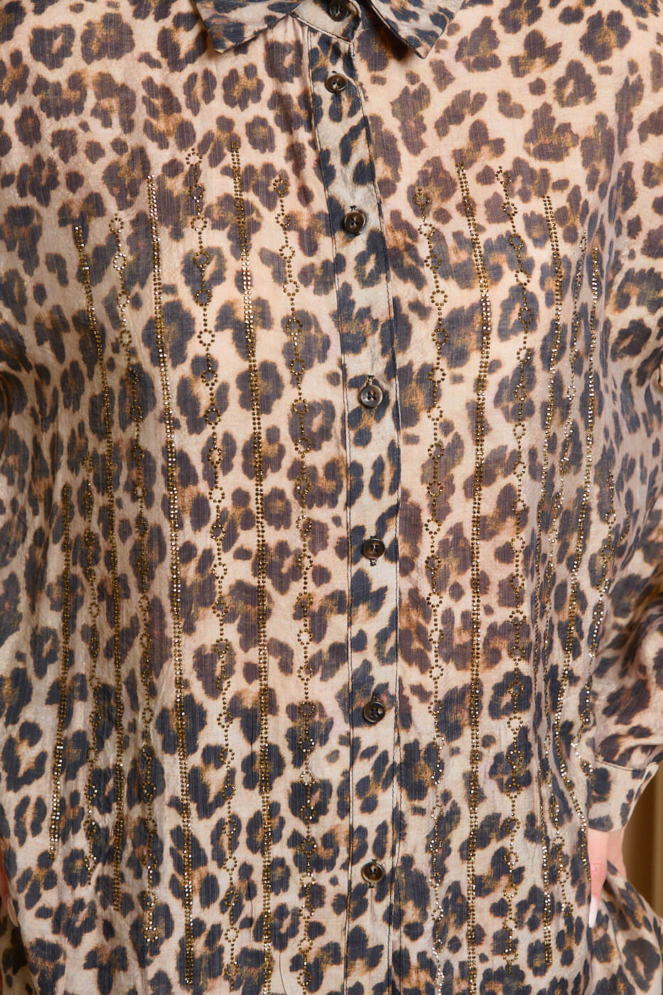 Πουκάμισο με print και σειρές από χρυσά στρας λεοπάρ. Ένα πουκάμισο see through με λεοπάρ σχέδιο σε όλη την επιφάνεια και στο μπροστά μέρος κάθετες σειρές από χρυσά στρας. Κλείνει με καφέ κουμπιά από πάνω μέχρι κάτω. Διαθέτει πέτο γιακά και μακριά μανίκια με μικρές μανσέτες και κουμπί.