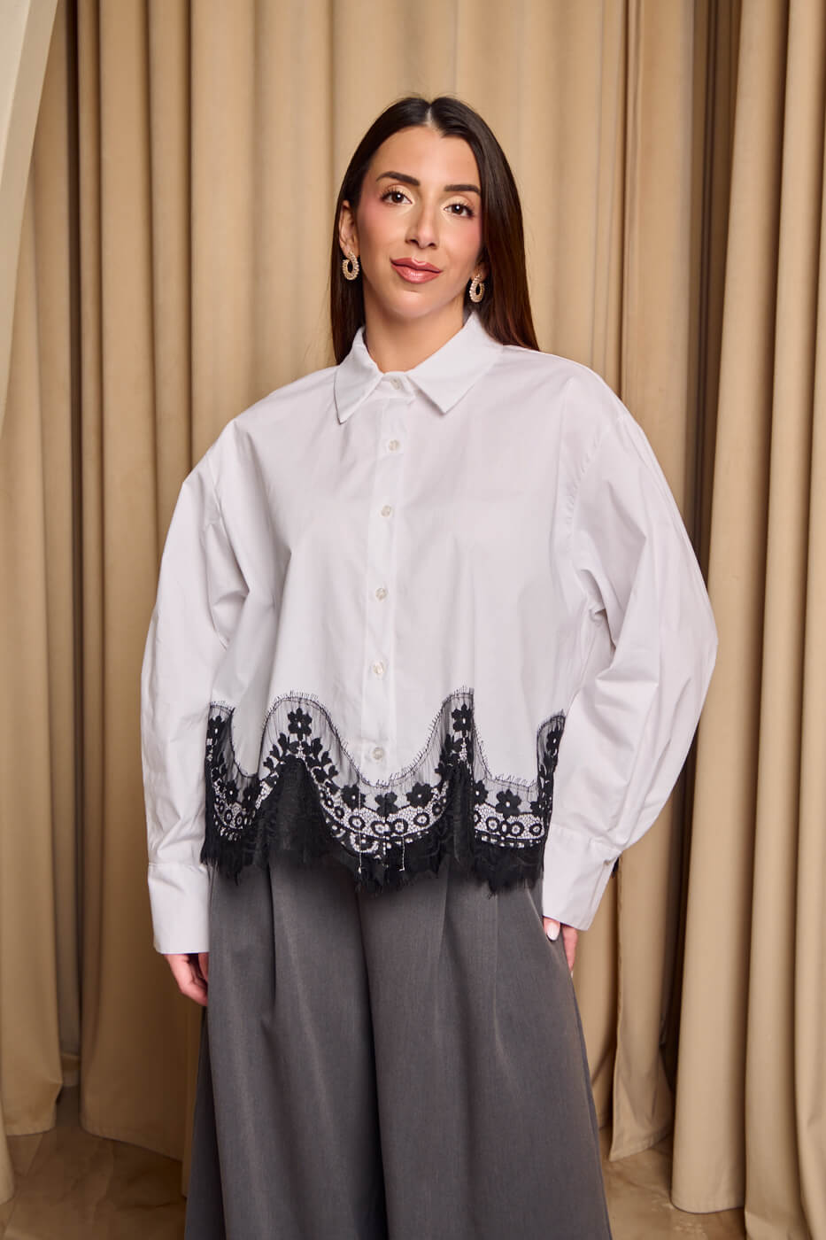 Πουκάμισο με σχέδιο δαντέλα στο κάτω μέρος λευκό. Στο κάτω μέρος διαθέτει σχέδιο με μαύρη δαντέλα. Κλείνει με κουμπιά από πάνω μέχρι κάτω. Διαθέτει πέτο γιακά και μακριά μανίκια.
