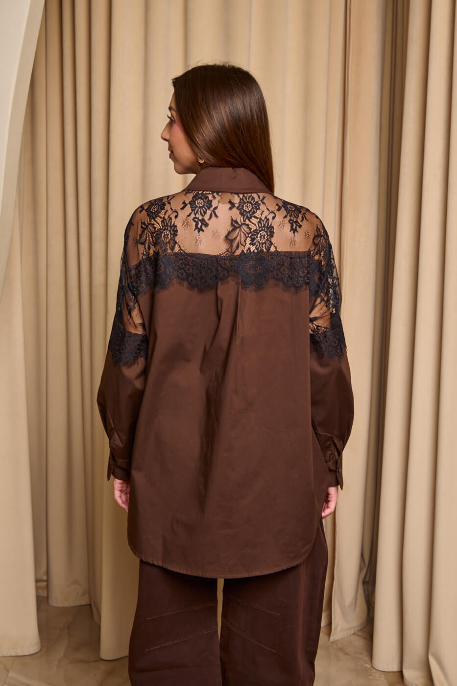 Πουκάμισο με σχέδιο δαντέλα στο πάνω μέρος σκούρο καφέ. Στο πάνω μέρος διαθέτει see through σχέδιο με μαύρη δαντέλα. Κλείνει με κουμπιά από πάνω μέχρι κάτω. Διαθέτει πέτο γιακά και μακριά μανίκια.