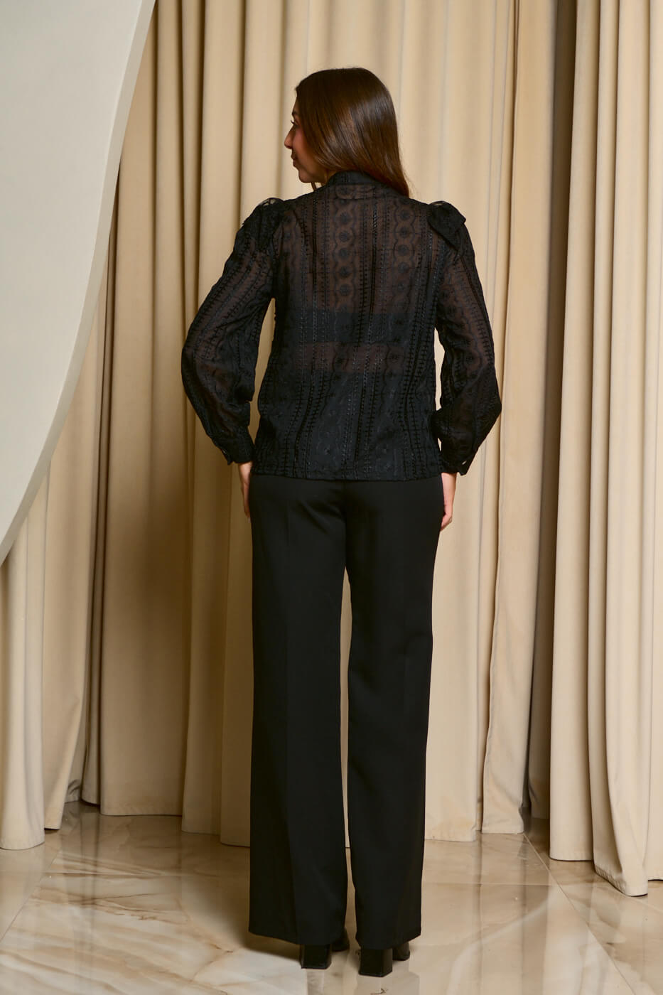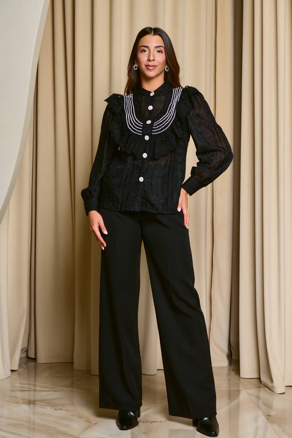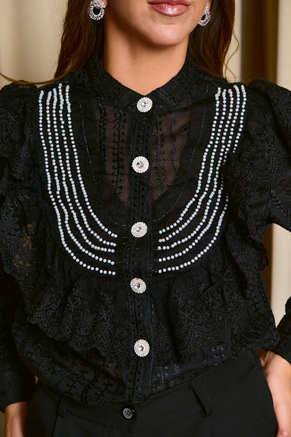 Πουκάμισο με σχέδιο κεντημένο πέρλες και κουμπιά κόσμημα μαύρο. Ένα πουκάμισο see through με ανάγλυφο σχέδιο σε όλη την επιφάνεια και κέντημα στο μπούστο διακοσμημένο με σειρές από πέρλες λευκές. Διαθέτει στρογγυλή λαιμόκοψη με λεπτά σουραρίσματα γύρω και κλείνει από πάνω μέχρι κάτω με κουμπιά κόσμημα.