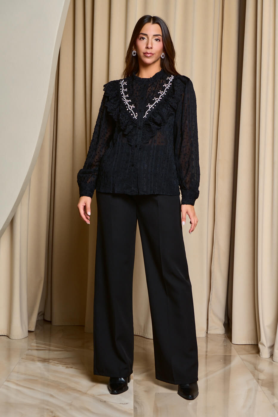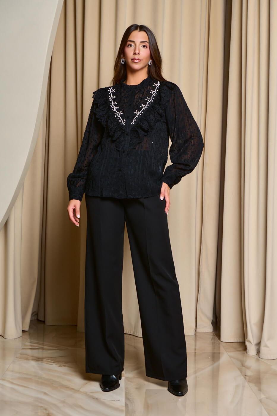 Πουκάμισο με σχέδιο κεντημένο πέρλες και στρας μαύρο. Μια μπλούζα see through με ανάγλυφο σχέδιο σε όλη την επιφάνεια και κέντημα στο μπούστο διακοσμημένο με πέρλες λευκές και στρας. Διαθέτει στρογγυλή λαιμόκοψη με λεπτά σουραρίσματα γύρω και κλείνει από πάνω μέχρι κάτω με μαύρα κουμπιά μπροστά.