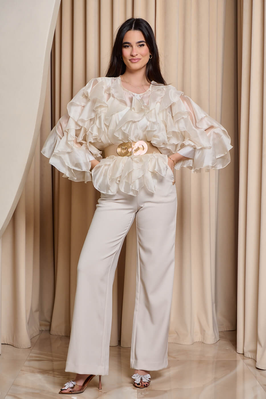 Στο μπροστινό μέρος διαθέτει μεγάλα, εντυπωσιακά κάθετα βολάν που προσφέρουν μια υπέροχη κίνηση. Έχει στρογγυλή λαιμόκοψη. Τα μανίκια είναι μακριά με βολάν και μανσέτα με κουμπί στο τελείωμα. Το πίσω μέρος είναι see through χωρίς βολάν. Κλείνει μπροστά με κουμπιά.