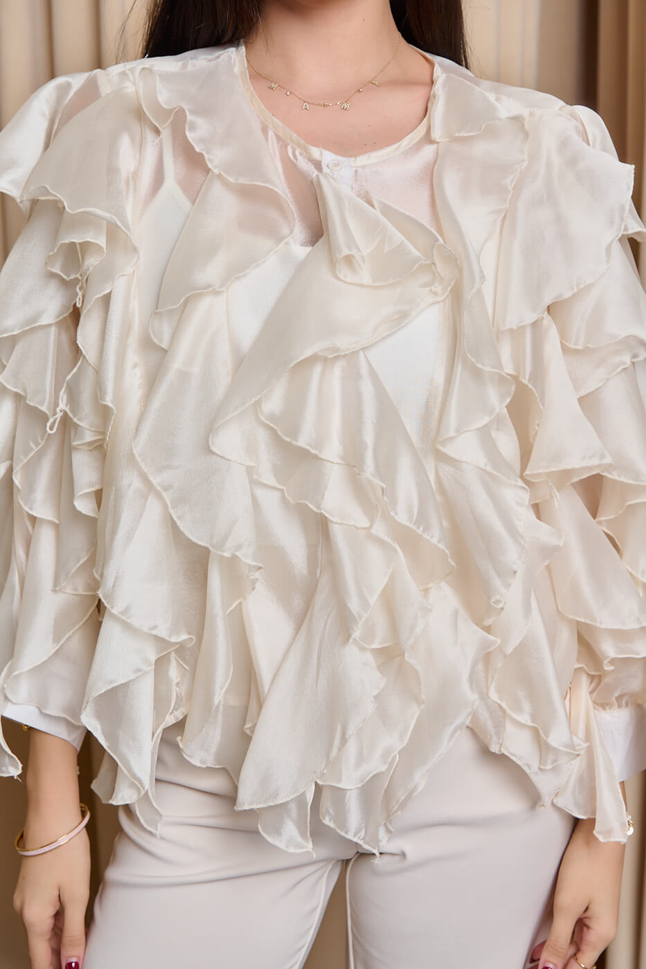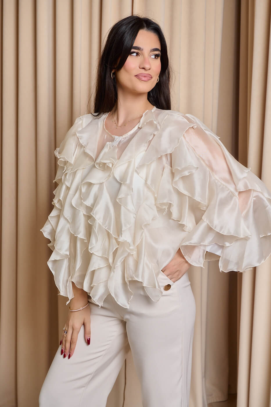 Πουκάμισο σατινέ με βολάν μπεζ