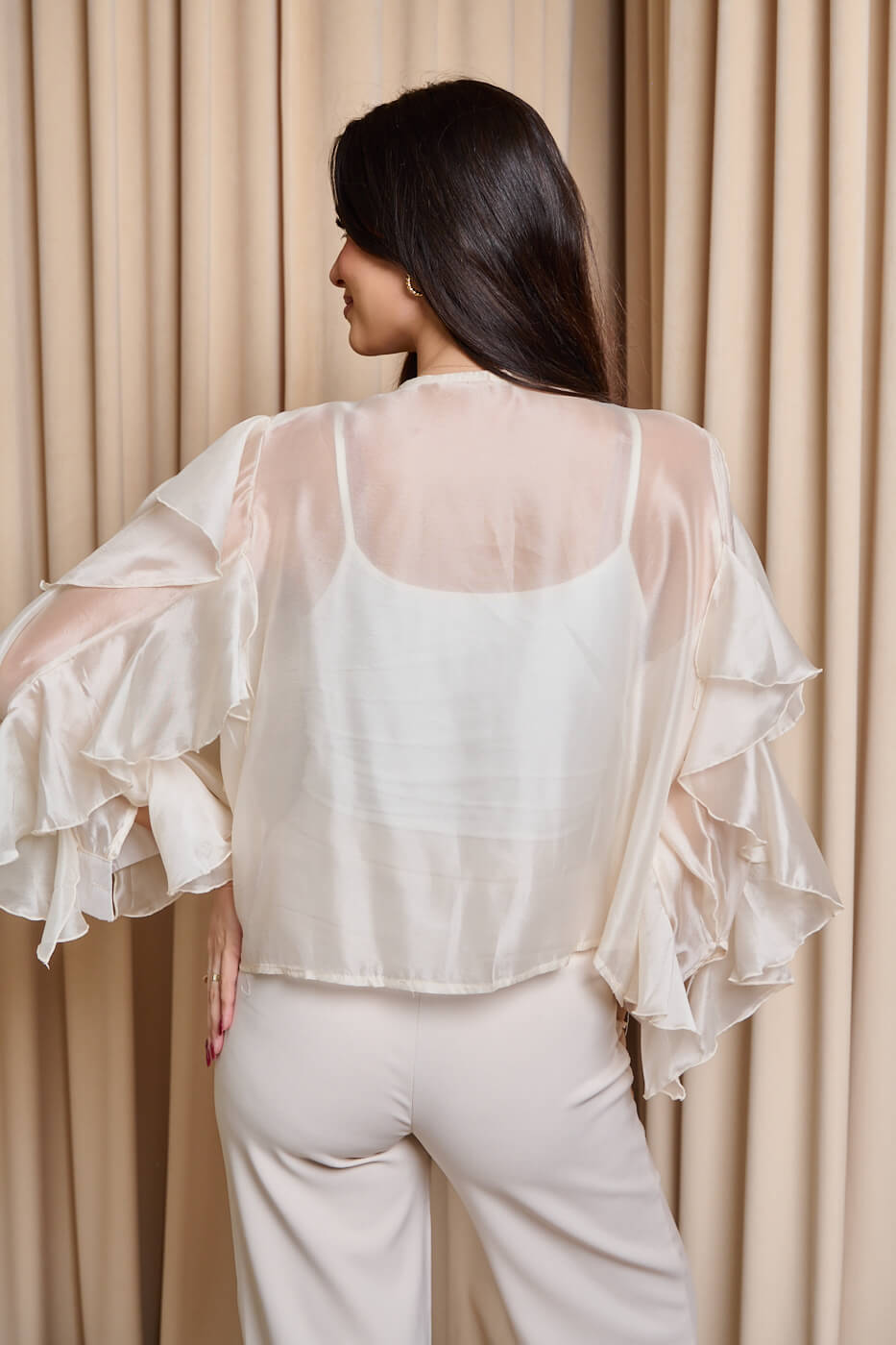 Πουκάμισο σατινέ με βολάν μπεζ. Ένα εντυπωσιακό see through πουκάμισο σε μπεζ απόχρωση. Στο μπροστινό μέρος διαθέτει μεγάλα, εντυπωσιακά κάθετα βολάν που προσφέρουν μια υπέροχη κίνηση. Έχει στρογγυλή λαιμόκοψη. Τα μανίκια είναι μακριά με βολάν και μανσέτα με κουμπί στο τελείωμα. Το πίσω μέρος είναι see through χωρίς βολάν. Κλείνει μπροστά με κουμπιά. Μια κομψή και εντυπωσιακή επιλογή που μπορεί να φορεθεί όλες τις ώρες της ημέρας και να αναβαθμίσει κάθε εμφάνιση. Μπορεί να συνδυαστεί με τζιν, υφασμάτινα παντελόνια ή και φούστα.