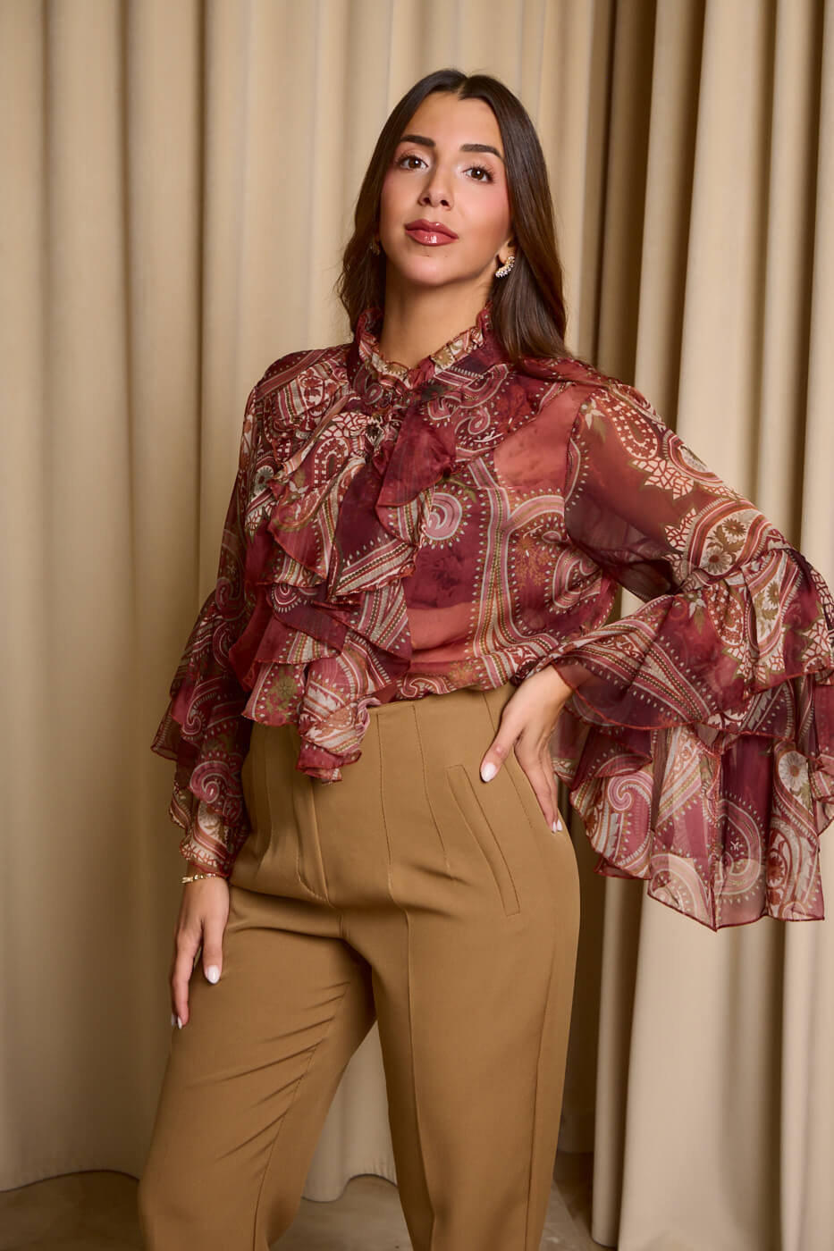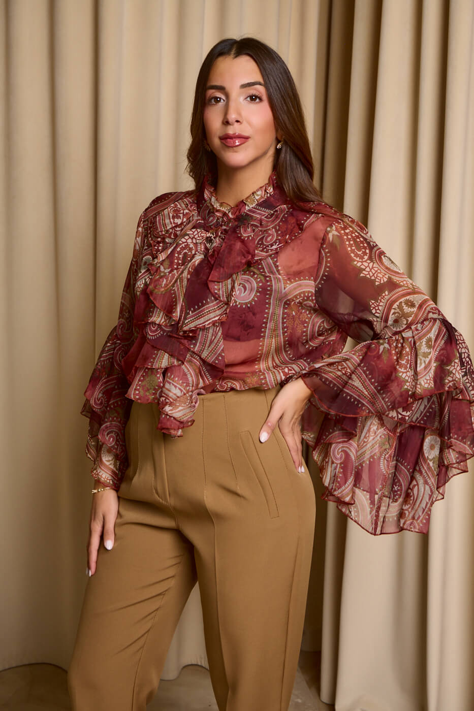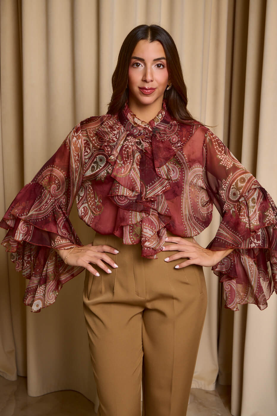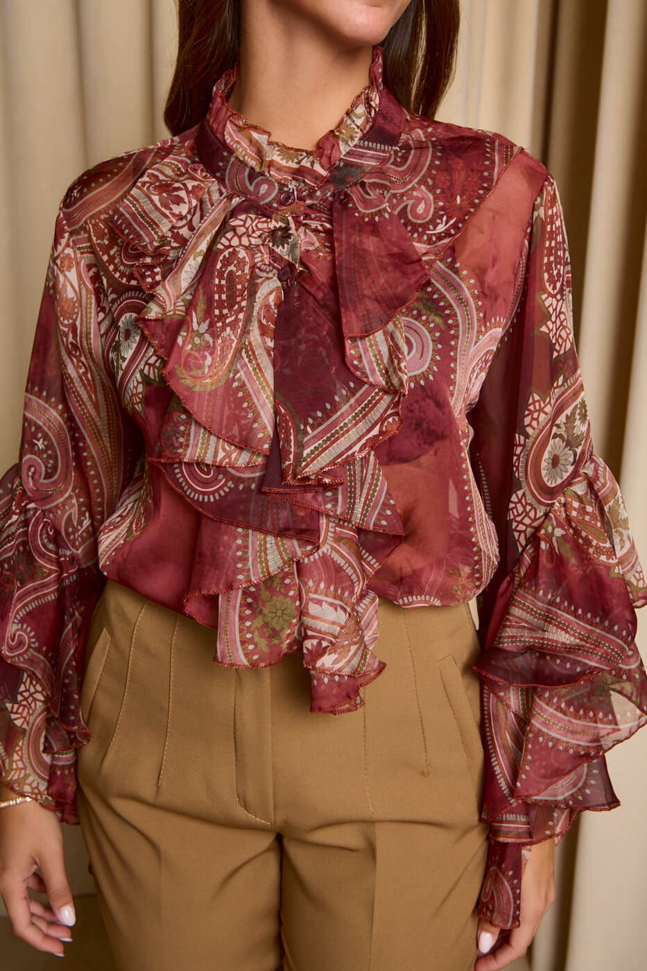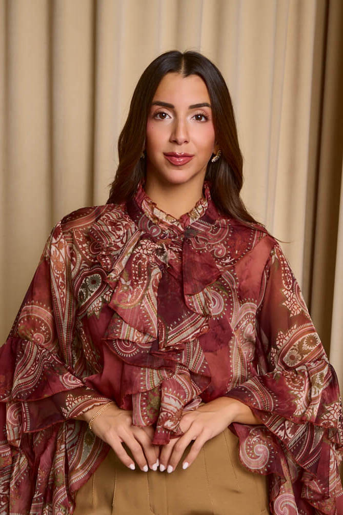 Πουκάμισο see through λαχούρ με φραμπαλά γιακά μπορντό. Μακρυμάνικο πουκάμισο που έχει φραμπαλά στο γιακά και στα μανίκια βολάν. Κλείνει με κουμπιά από πάνω μέχρι κάτω.