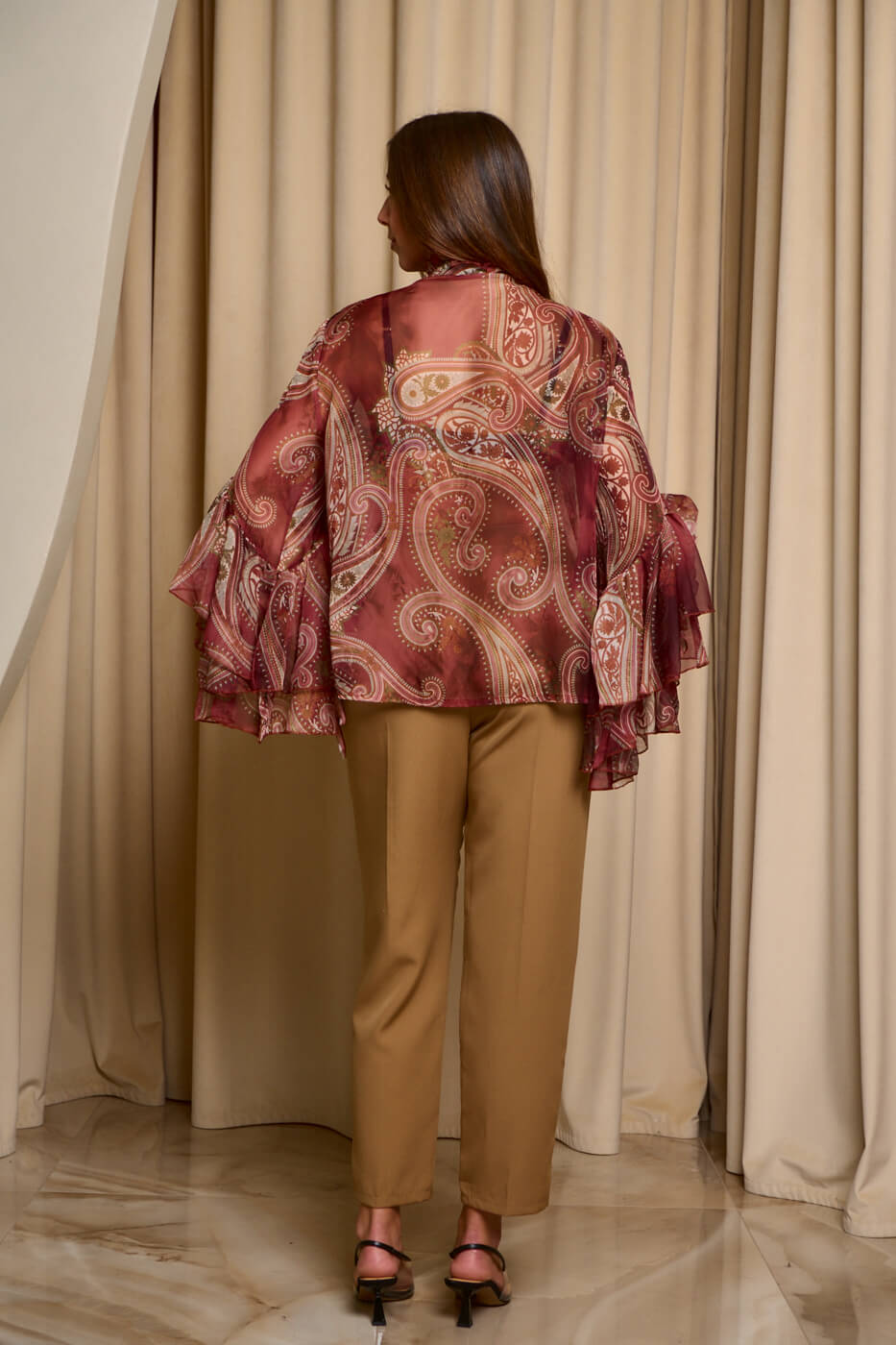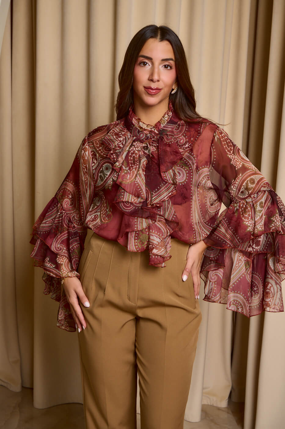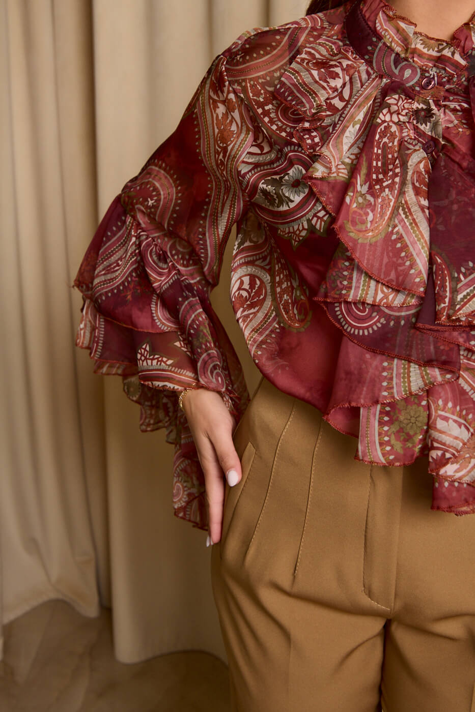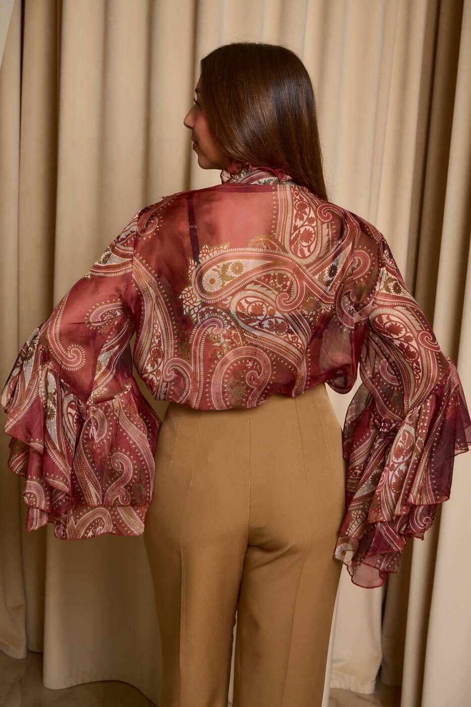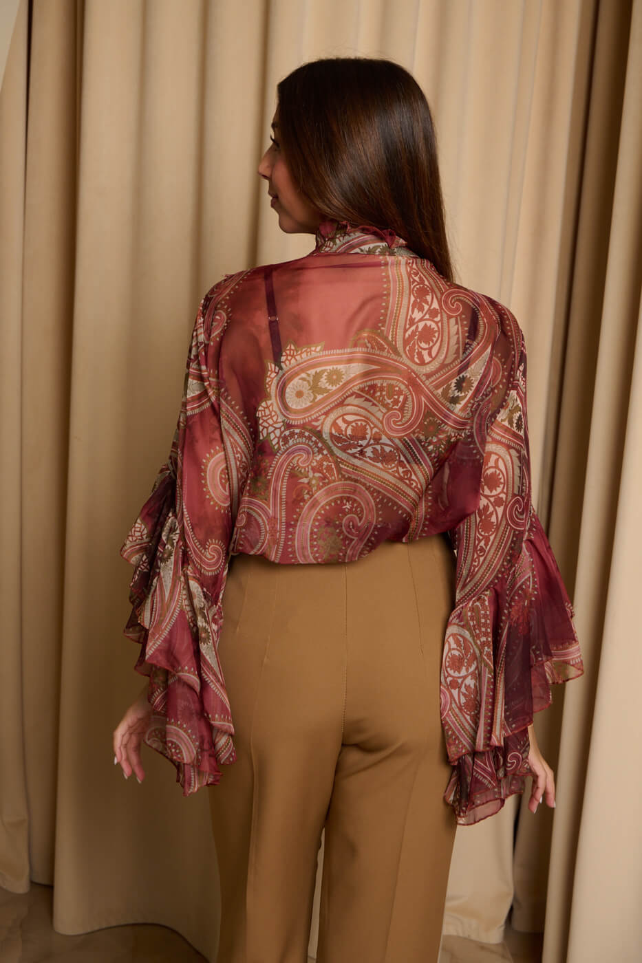 Πουκάμισο see through λαχούρ με φραμπαλά γιακά μπορντό. Μακρυμάνικο πουκάμισο που έχει φραμπαλά στο γιακά και στα μανίκια βολάν. Κλείνει με κουμπιά από πάνω μέχρι κάτω.