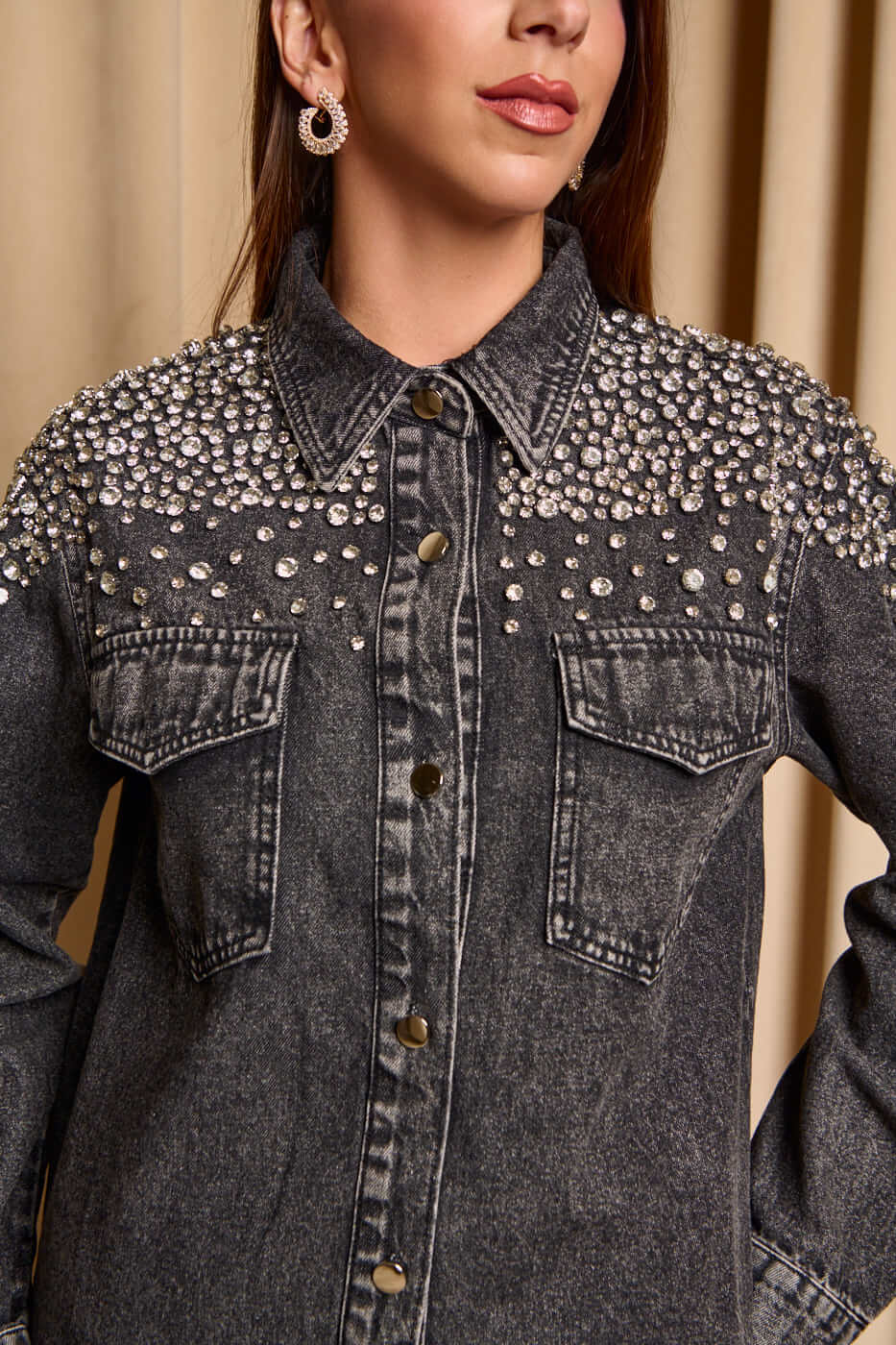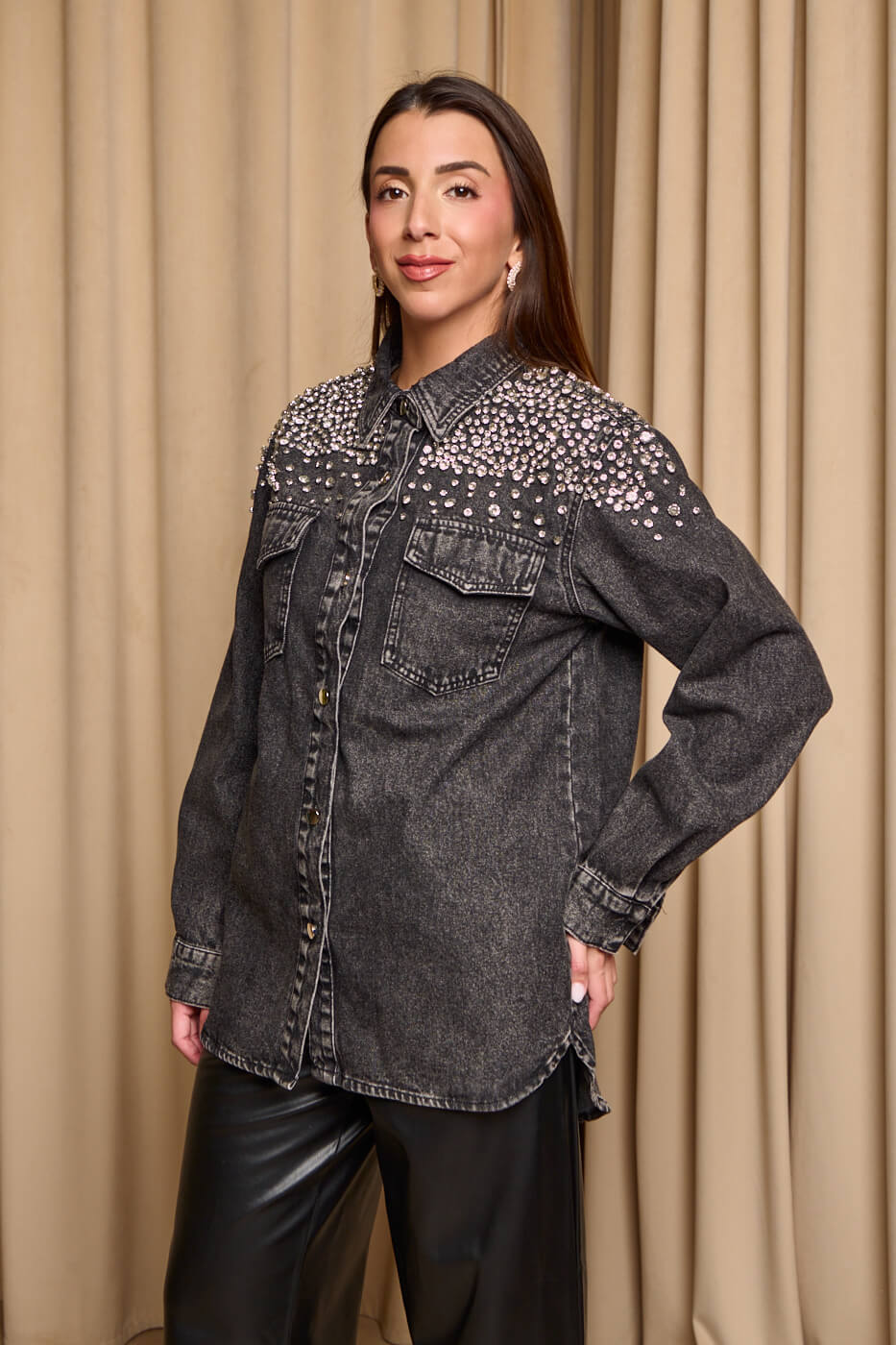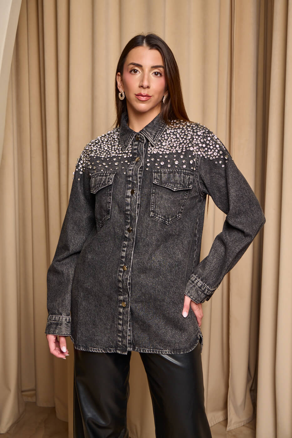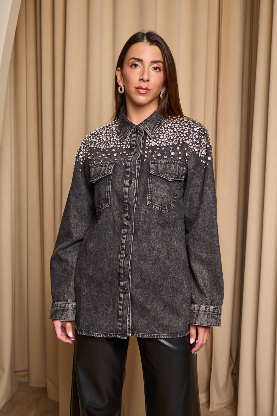 Πουκάμισο τζιν γκρι με πέτρες. Με πέτο γιακά, μακριά μανίκια με μανσέτα στο τελείωμα και κουμπί. Διακοσμημένο στο πάνω μέρος με λευκές και γκρι πέτρες. Έχει τσέπη στο στήθος. Ανοίγει μπροστά με κουπιά.