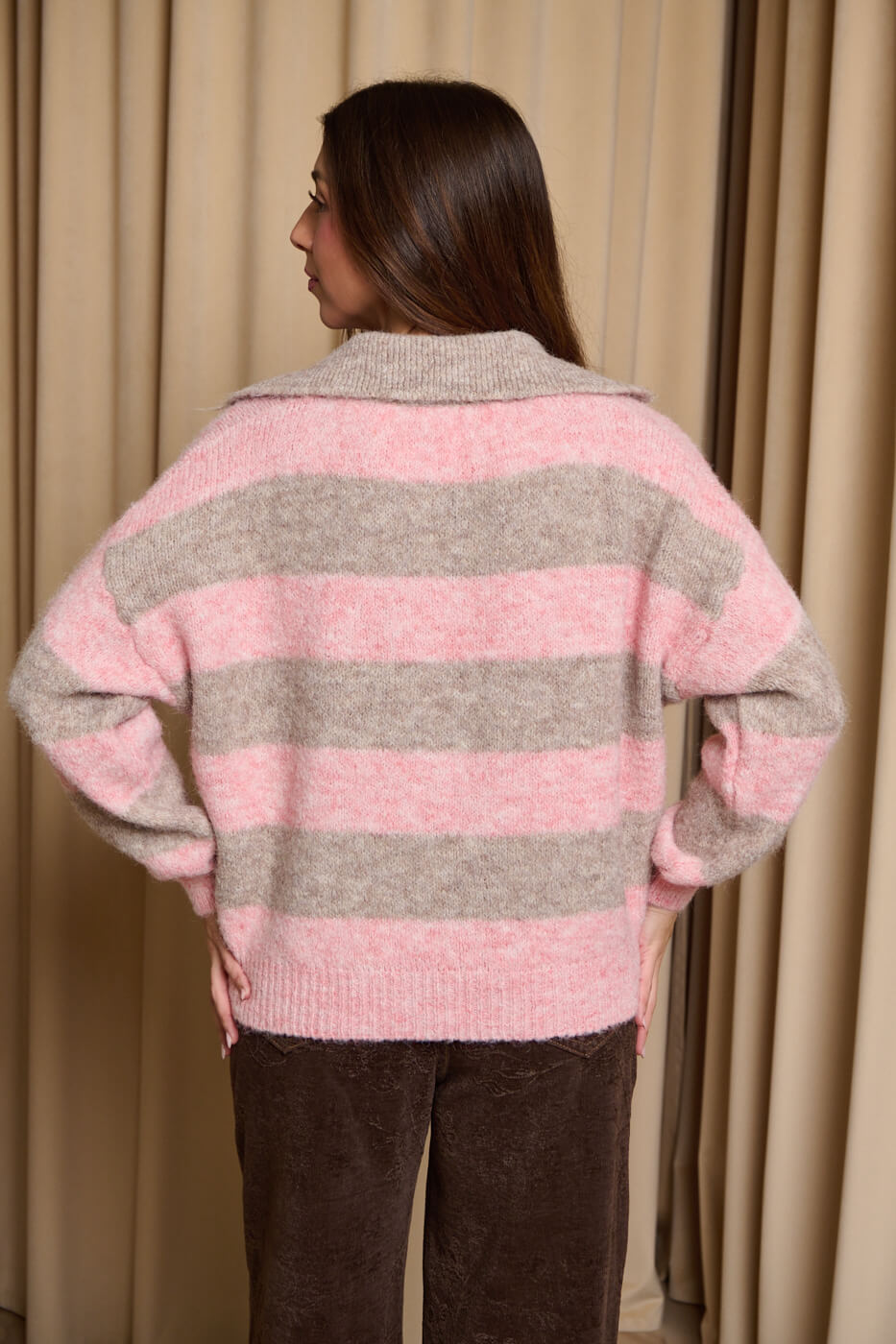 Πουλόβερ με ρίγες ροζ – πούρο . Απαλό και cozy πουλόβερ με φαρδιές οριζόντιες ρίγες σε αποχρώσεις του ροζ και του πούρου. Διαθέτει χαλαρή εφαρμογή , φαρδιά μανίκια και V λαιμόκοψη με γιακά.