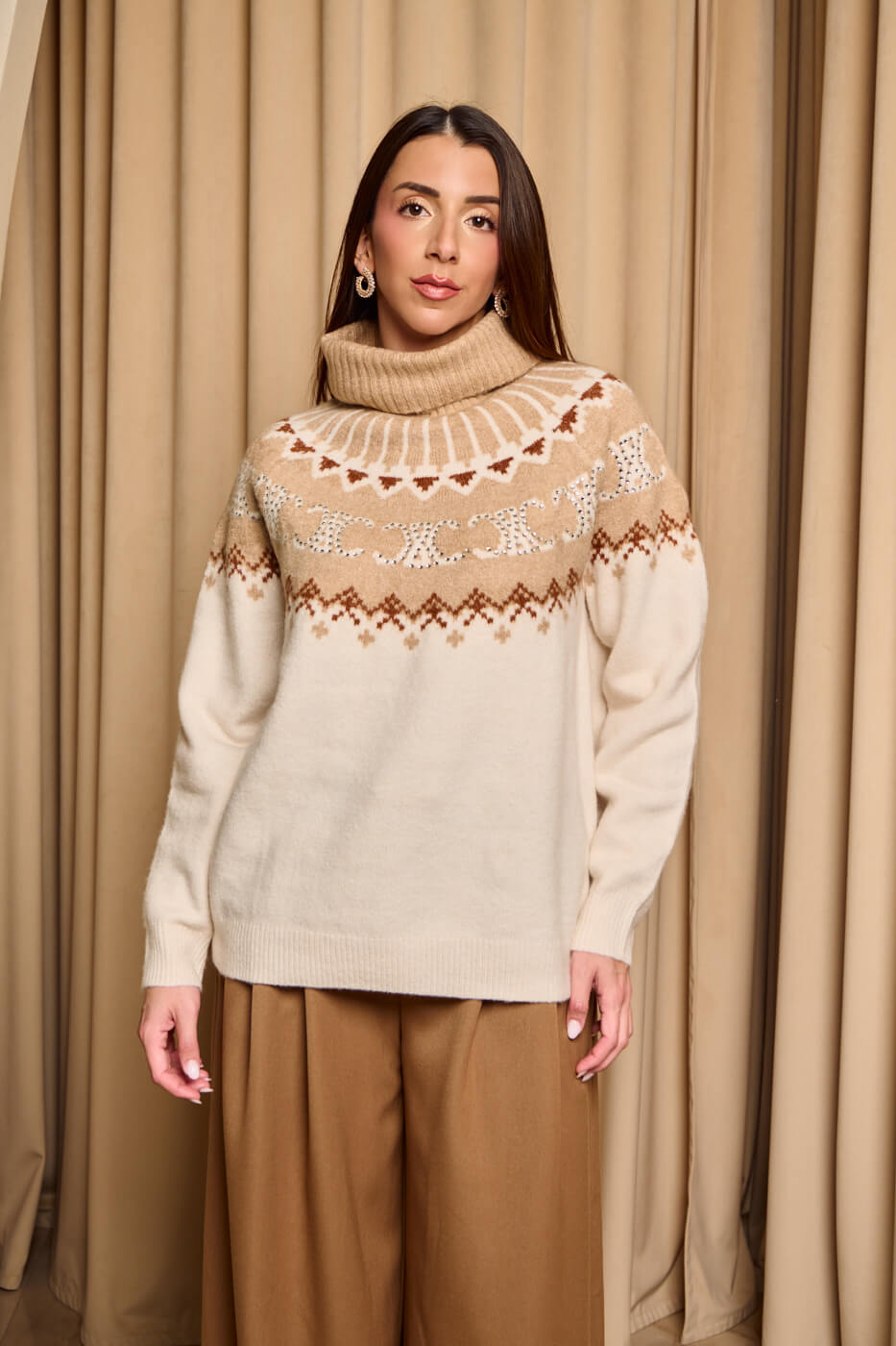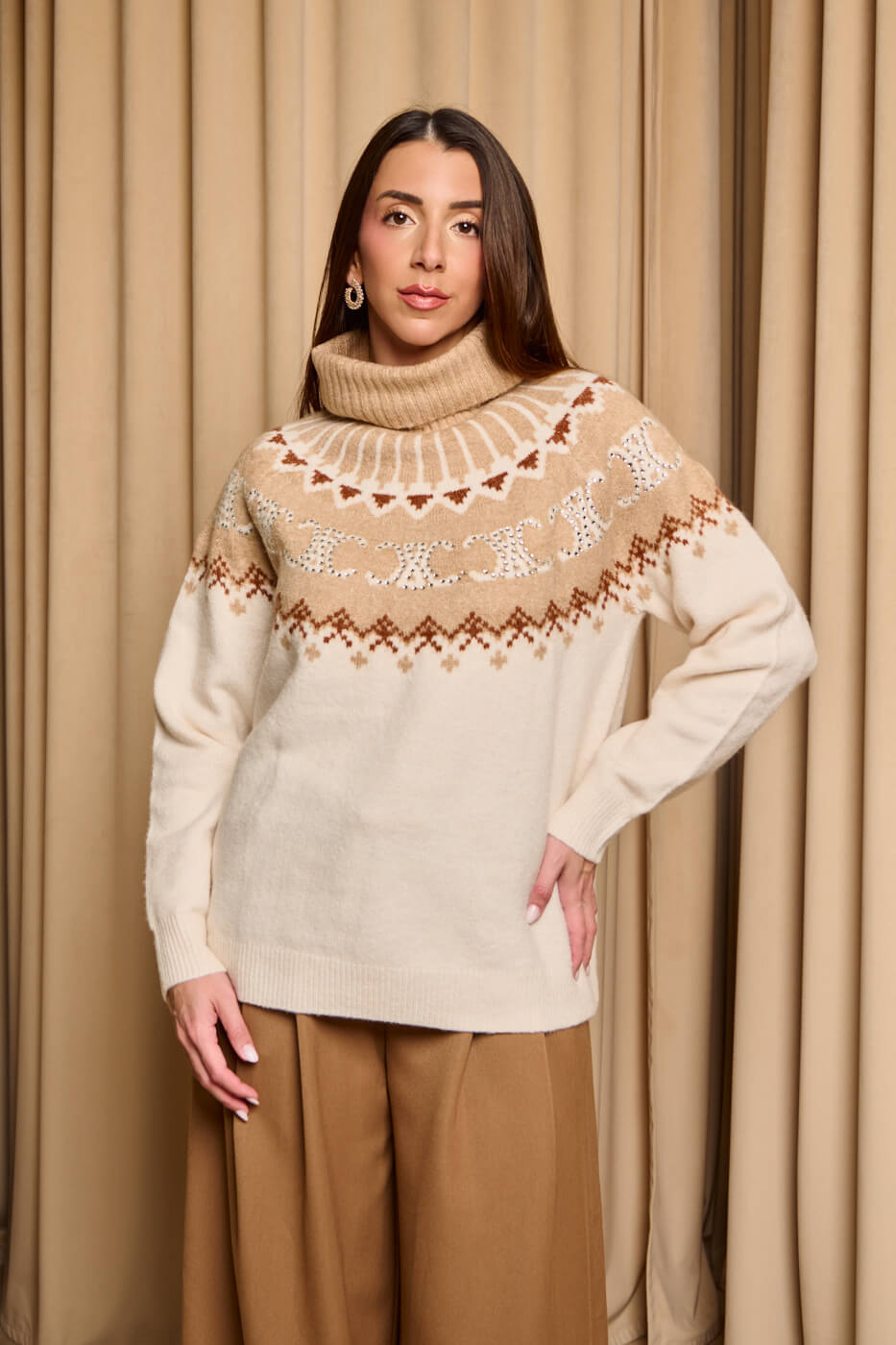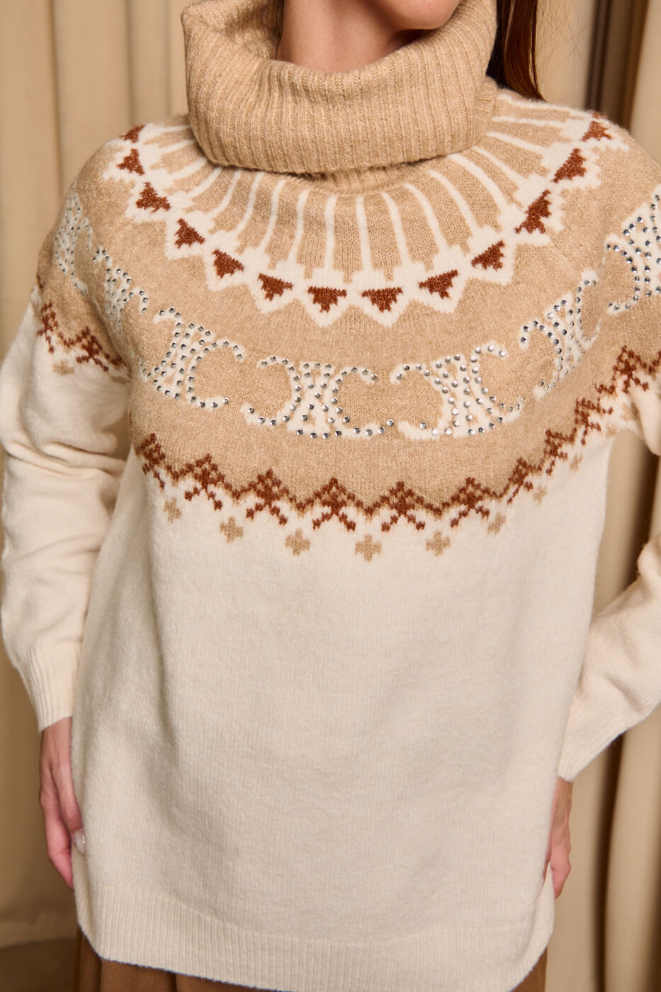 Πουλόβερ πλεκτό με σχέδιο και στρας μπεζ – εκρού .  Ένα ζεστό πουλόβερ με συνδυασμό γήινων αποχρώσεων του μπεζ και του εκρού καφέ και  διακριτικές λαμπερές λεπτομέρειες που χαρίζουν λάμψη και κομψότητα. Διαθέτει ψιλό ελαστικό γιακά τύπου ζιβάγκο. Η μαλακή υφή του και η άνετη γραμμή το καθιστούν ιδανική επιλογή για cozy χειμερινές εμφανίσεις.