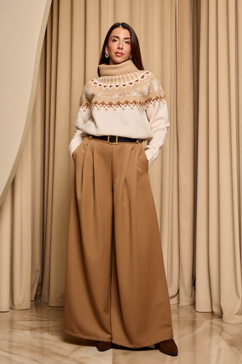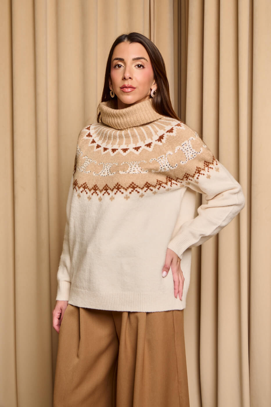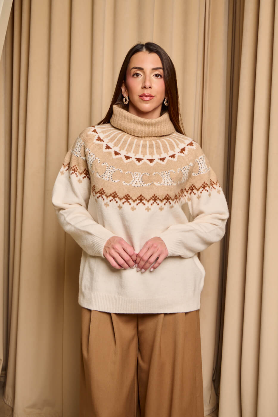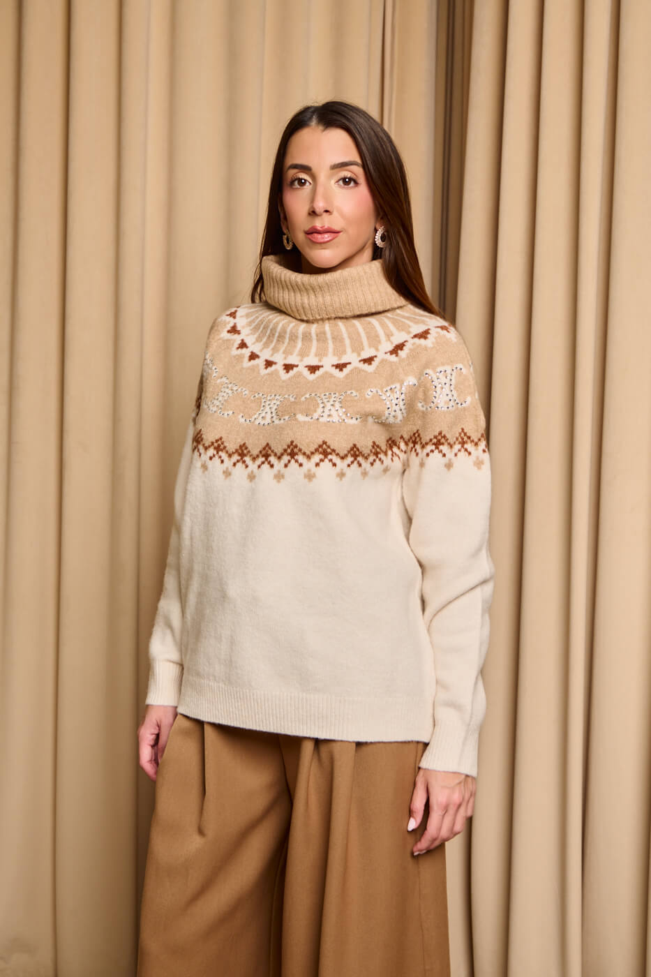 Πουλόβερ πλεκτό με σχέδιο και στρας μπεζ – εκρού .  Ένα ζεστό πουλόβερ με συνδυασμό γήινων αποχρώσεων του μπεζ και του εκρού καφέ και  διακριτικές λαμπερές λεπτομέρειες που χαρίζουν λάμψη και κομψότητα. Διαθέτει ψιλό ελαστικό γιακά τύπου ζιβάγκο. Η μαλακή υφή του και η άνετη γραμμή το καθιστούν ιδανική επιλογή για cozy χειμερινές εμφανίσεις.
