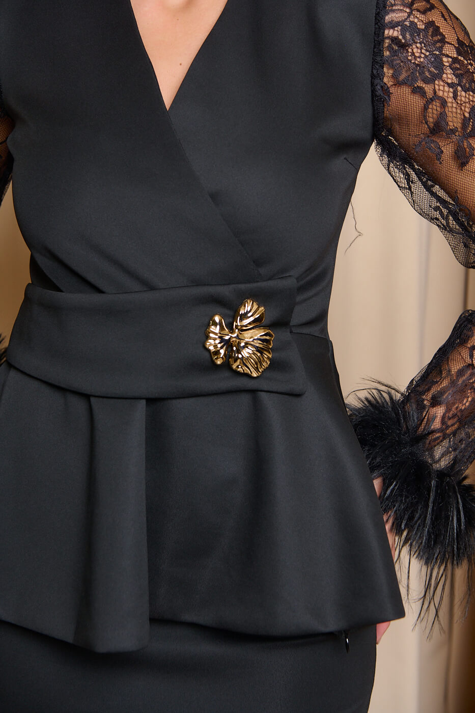Σετ μπλούζα-φούστα με δαντέλα και πούπουλα μαύρο. Ένα κομψό και θηλυκό σετ. Αποτελείται από μπλούζα και midi φούστα. Η μπλούζα διαθέτει κρουαζέ σχέδιο στο μπούστο , πέπλουμ κόψιμο που αναδεικνύει τη μέση και χρυσή διακοσμητική αγκράφα. Επιπλέον, έχει εντυπωσιακά μανίκια δαντέλα με πούπουλα στις μανσέτες. Η φούστα είναι midi σε ίσια γραμμή με κομψό σκίσιμο στο πίσω μέρος. Κλείνει με φερμουάρ και διαθέτει εσωτερική φόδρα. Ένα σετ για εντυπωσιακές εμφανίσεις που σίγουρα θα τραβήξουν τα βλέμματα.