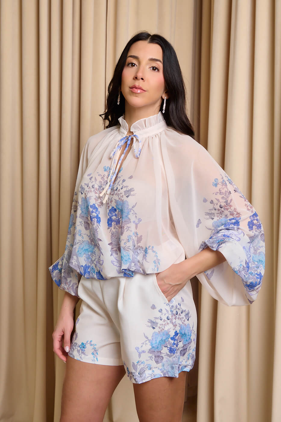 Σετ μπλούζα – σορτς με floral μοτίβο γαλάζιο. Το απόλυτα άνετο και κομψό σετ με γαλάζιο floral μοτίβο πάνω σε εκρού βάση. Αποτελείται από αέρινη see through μπλούζα με mao γιακά με βολάν που δένει μπροστά. Τα μανίκια είναι μακριά balloon με λάστιχο στο τελείωμα. Το σορτς έχει το ίδιο floral μοτίβο. Διαθέτει λάστιχο στη μέση, τσέπες και θηλύκια για να μπορεί να μπει ζώνη. Ένα άνετο σετ που μπορεί με το κατάλληλο styling να φορεθεί από το πρωί έως το βράδυ και να προσφέρει κομψές, αέρινες και στιλάτες εμφανίσεις.