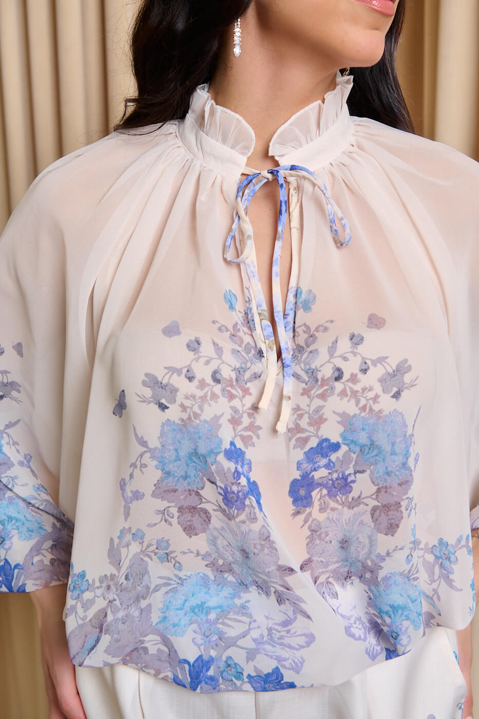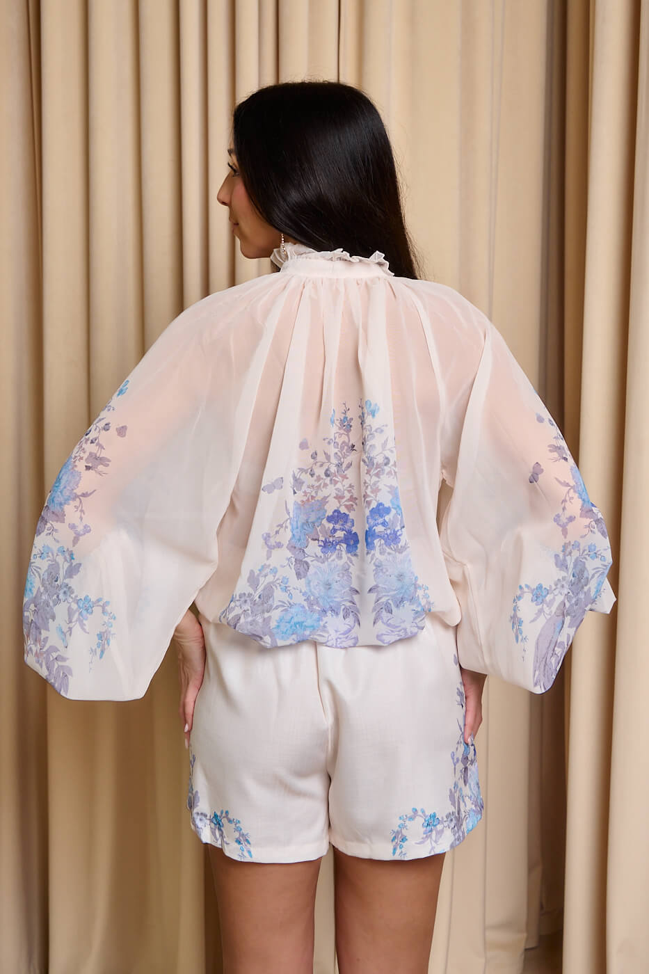 Αποτελείται από αέρινη see through μπλούζα με mao γιακά με βολάν που δένει μπροστά. Τα μανίκια είναι μακριά balloon με λάστιχο στο τελείωμα. Το σορτς έχει το ίδιο floral μοτίβο. Διαθέτει λάστιχο στη μέση, τσέπες και θηλύκια για να μπορεί να μπει ζώνη.