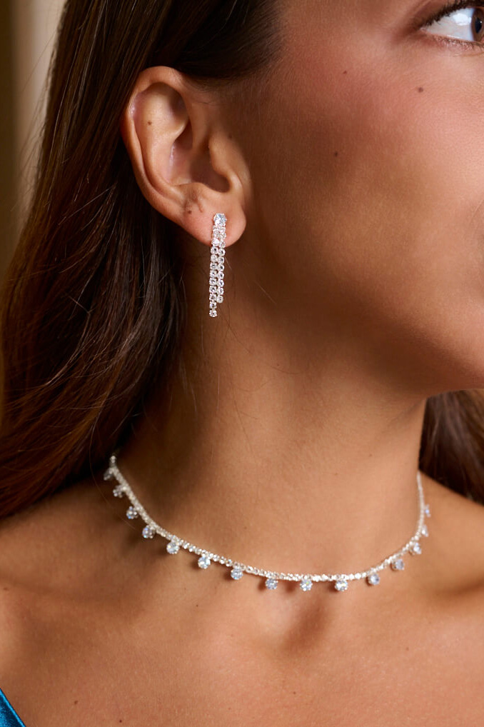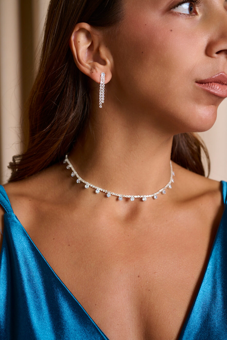 Σετ κολιέ – σκουλαρίκια κρεμαστά με στρας και κρυστάλλους ασημί. Ένα εντυπωσιακό σετ από ανοξείδωτο ατσάλι που περιλαμβάνει κολιέ με μικρές πέτρες strass και είναι διακοσμημένο με μικρούς κρυστάλλους που πέφτουν για έξτρα κίνηση και λάμψη. Το κολιέ διαθέτει ρυθμιζόμενο κούμπωμα και τα σκουλαρίκια έχουν κούμπωμα – καρφί στο πίσω μέρος. Αυτό το σετ κοσμημάτων μπορεί να αναβαθμίσει κάθε σας εμφάνιση.