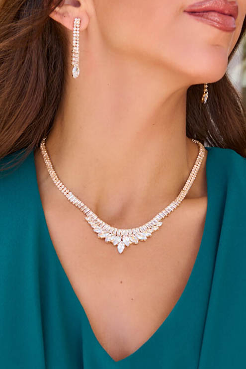 Σετ κολιέ – σκουλαρίκια με στρας και κρυστάλλους χρυσό. Ένα εντυπωσιακό σετ από ανοξείδωτο ατσάλι που περιλαμβάνει κολιέ σχέδιο με κρυστάλλους και διακοσμημένα με πολλά μικρά στρας. Η υπόλοιπη αλυσίδα ακολουθεί πιο απλό μοτίβο με επαναλαμβανόμενα λαμπερά στρας, διατηρώντας την ισορροπία στο σχέδιο. Τα σκουλαρίκια είναι στο ίδιο ύφος με το κολιέ. Το κολιέ διαθέτει ρυθμιζόμενο κούμπωμα και τα σκουλαρίκια έχουν κούμπωμα – καρφί στο πίσω μέρος. Αυτό το σετ κοσμημάτων μπορεί να αναβαθμίσει κάθε σας εμφάνιση.
