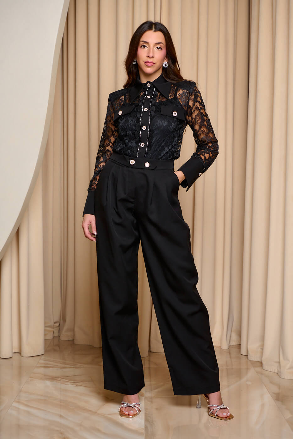 Σετ παντελόνι – πουκάμισο με δαντέλα μαύρο. Ένα εντυπωσιακό σετ που συνδυάζει κομψότητα και σύγχρονο στυλ. Αποτελείται από μαύρο πουκάμισο και μαύρο παντελόνι. Το πουκάμισο είναι δαντέλα με γιακά και διακοσμητικές τσέπες. Ακόμα, διαθέτει κουμπιά – κόσμημα που κλείνουν μπροστά και τα μανίκια καταλήγουν σε μεγάλες μαύρες μανσέτες. Έχει αποσπώμενο μεσοφόρι. Το παντελόνι είναι σε ίσια γραμμή με λάστιχο στη μέση , τσέπες και διακοσμητικό στοιχείο μπροστά με κουμπιά – κόσμημα. Κλείνει με φερμουάρ στο πλάι. Ιδανικό για κομψές εμφανίσεις με στυλ.