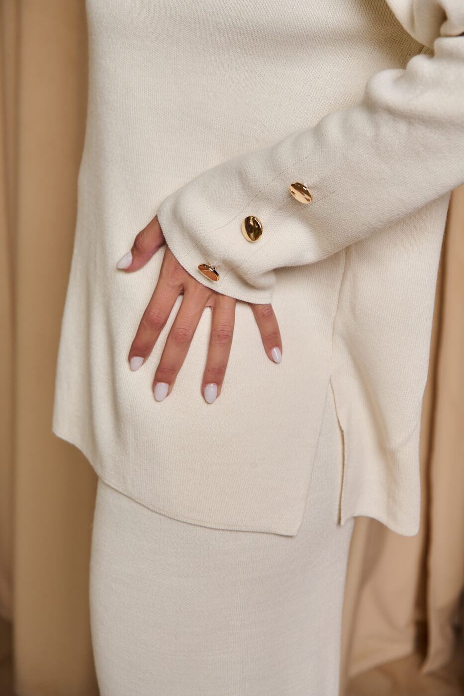 Σετ πλεκτό μπλούζα – παντελόνι με διακοσμητικά χρυσά κουμπιά μπεζ. Στρογγυλή λαιμόκοψη και στα μανίκια διαθέτει λεπτομέρειες από χρυσά κουμπιά. Το παντελόνι είναι ελαστικό και σε ίσια γραμμή στο τέλος έχει λεπτομέρειες από χρυσά κουμπιά.