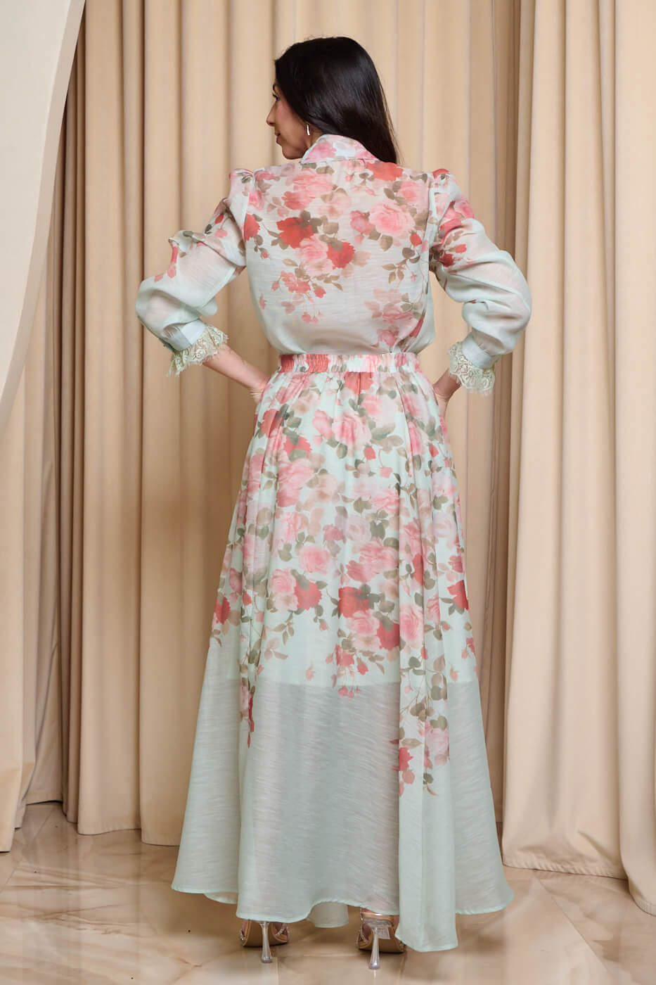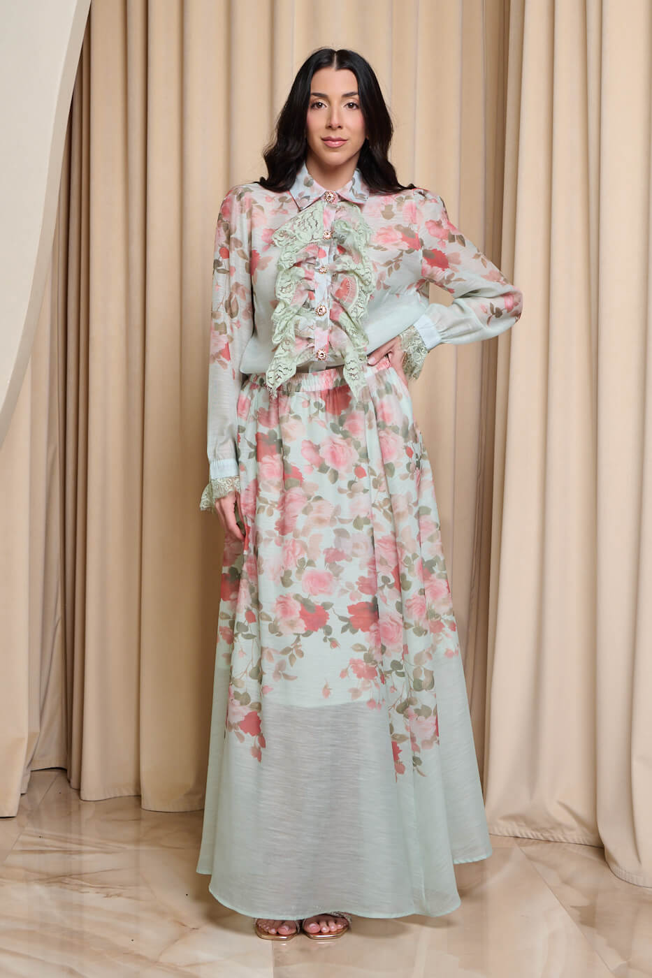 • Σετ πουκάμισο - φούστα floral με δαντέλα και κουμπιά κόσμημα μέντα