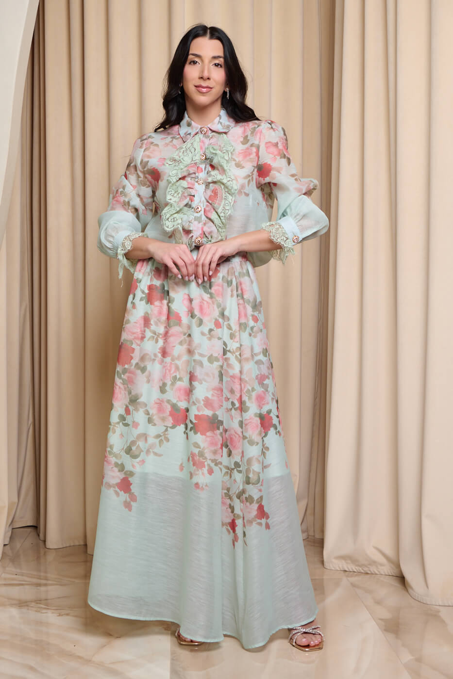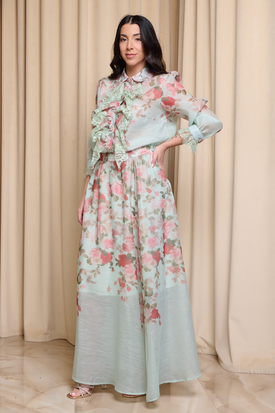 Σετ πουκάμισο – φούστα floral με δαντέλα και κουμπιά κόσμημα μέντα